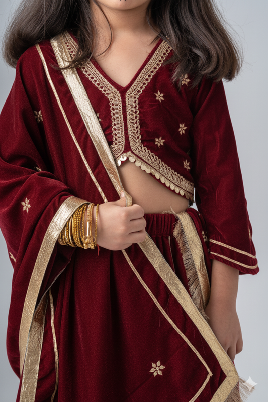 Girls Maharani Velvet embroidered lehenga choli with dupatta ethnic Clothing set - Maroon