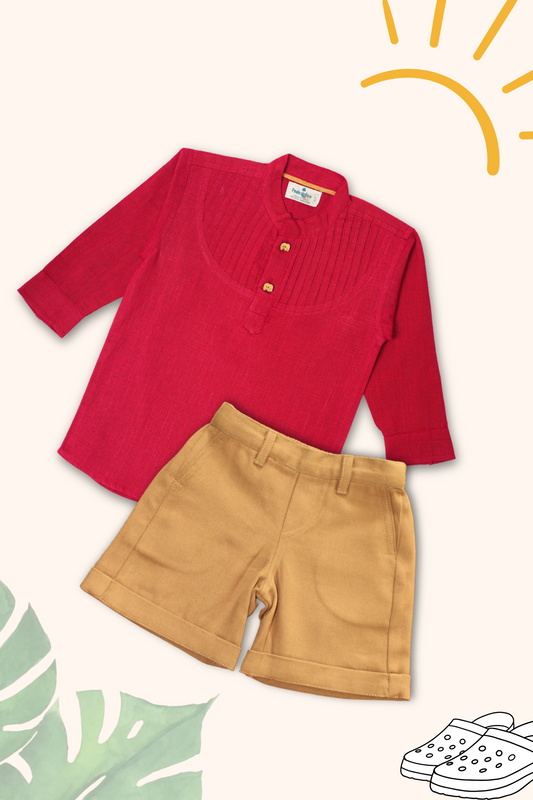 Boys Pure Cotton Clothing Set - Red Pintuck Shirt & Shorts