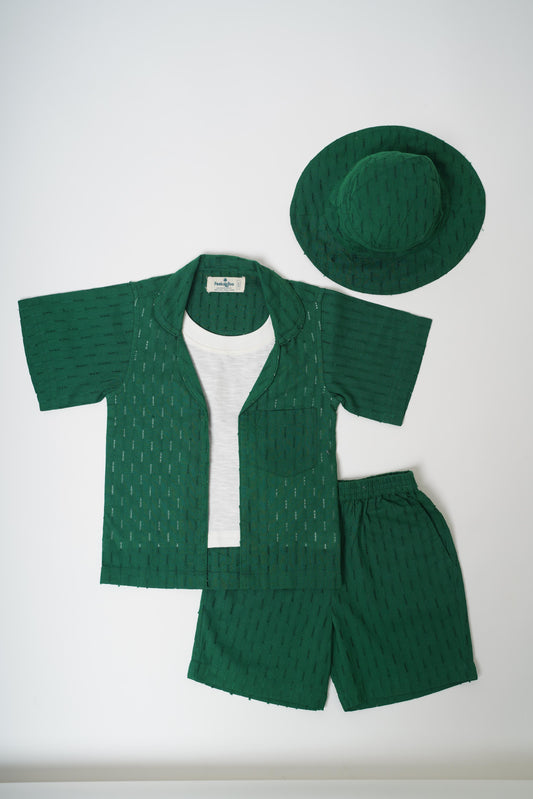 Boys Textured Cotton Green Resort Wear Set With Free beach hat