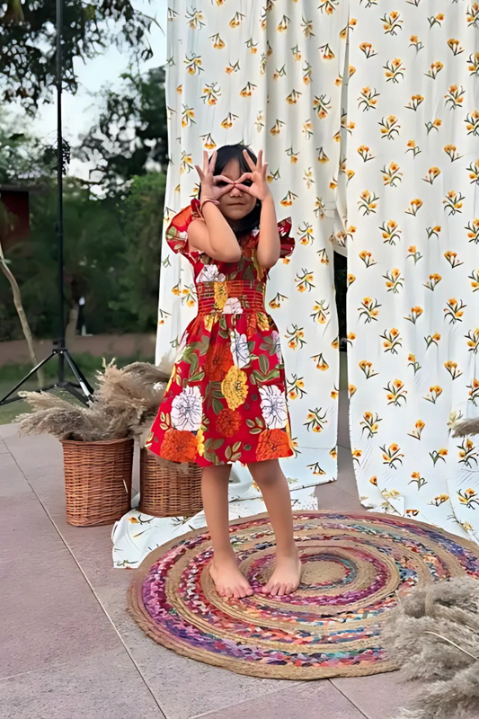 Girls Hourglass Cotton Smocked Waistline Dress - Red