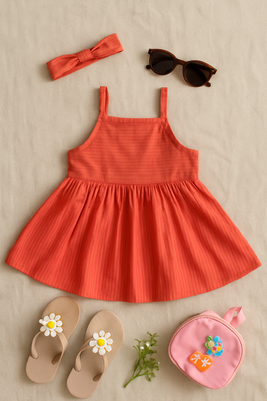 Girls Pure Cotton Seersucker Summer Dress - Solid Rust