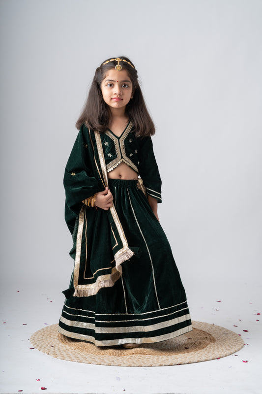 Girls Maharani Velvet embroidered lehenga choli with dupatta ethnic Clothing set - Bottle Green