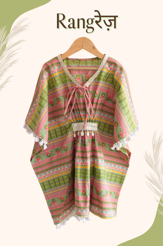 Girls Rangrez Pure Cotton Kaftaan - Green/Yellow