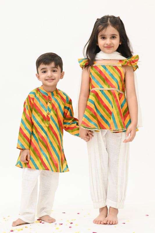 Girls Saavan 2.0 Pure Cotton Kurti Salwar & Dupatta Ethnic Clothing set - Multicolor Leheriya