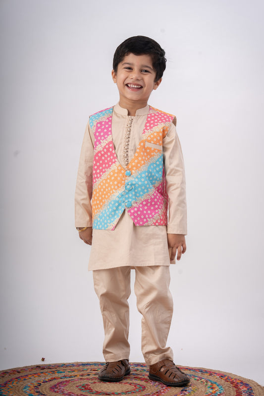 Boys Navrang Kurta Pant & Jacket 3 Piece Ethnic Clothing Set - Ivory Bandhej