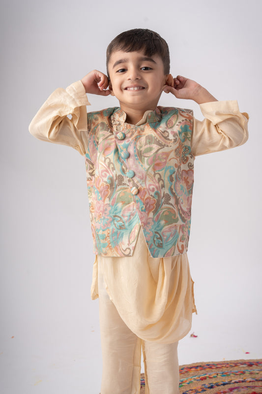 Boys Nawaab Silk Cowl Kurta Set with Bundi - Ivory