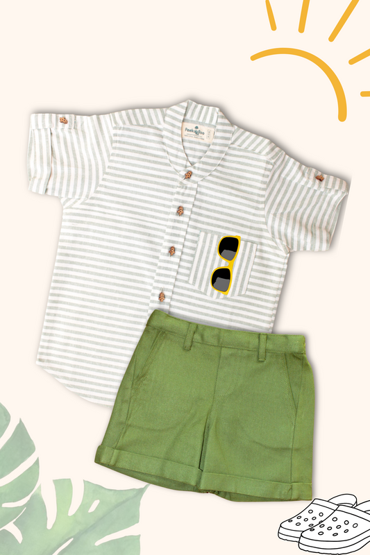 Boys Pure Cotton Clothing Set - Green Striped Half Sleeve Shirt & Shorts