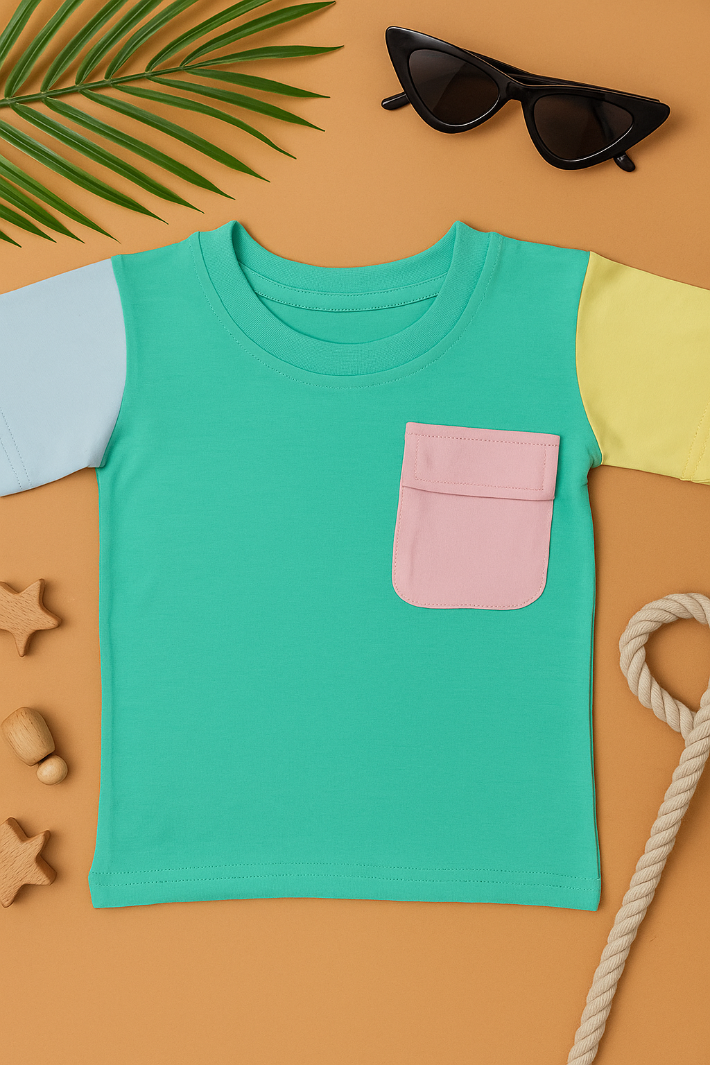 Boys 100% Cotton Knit solid color block T-shirt with 3D pocket - Green