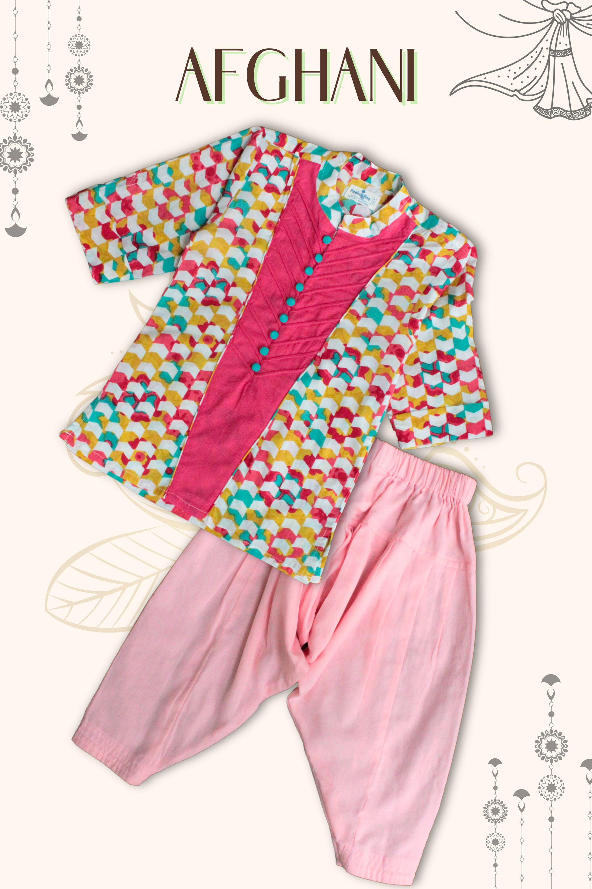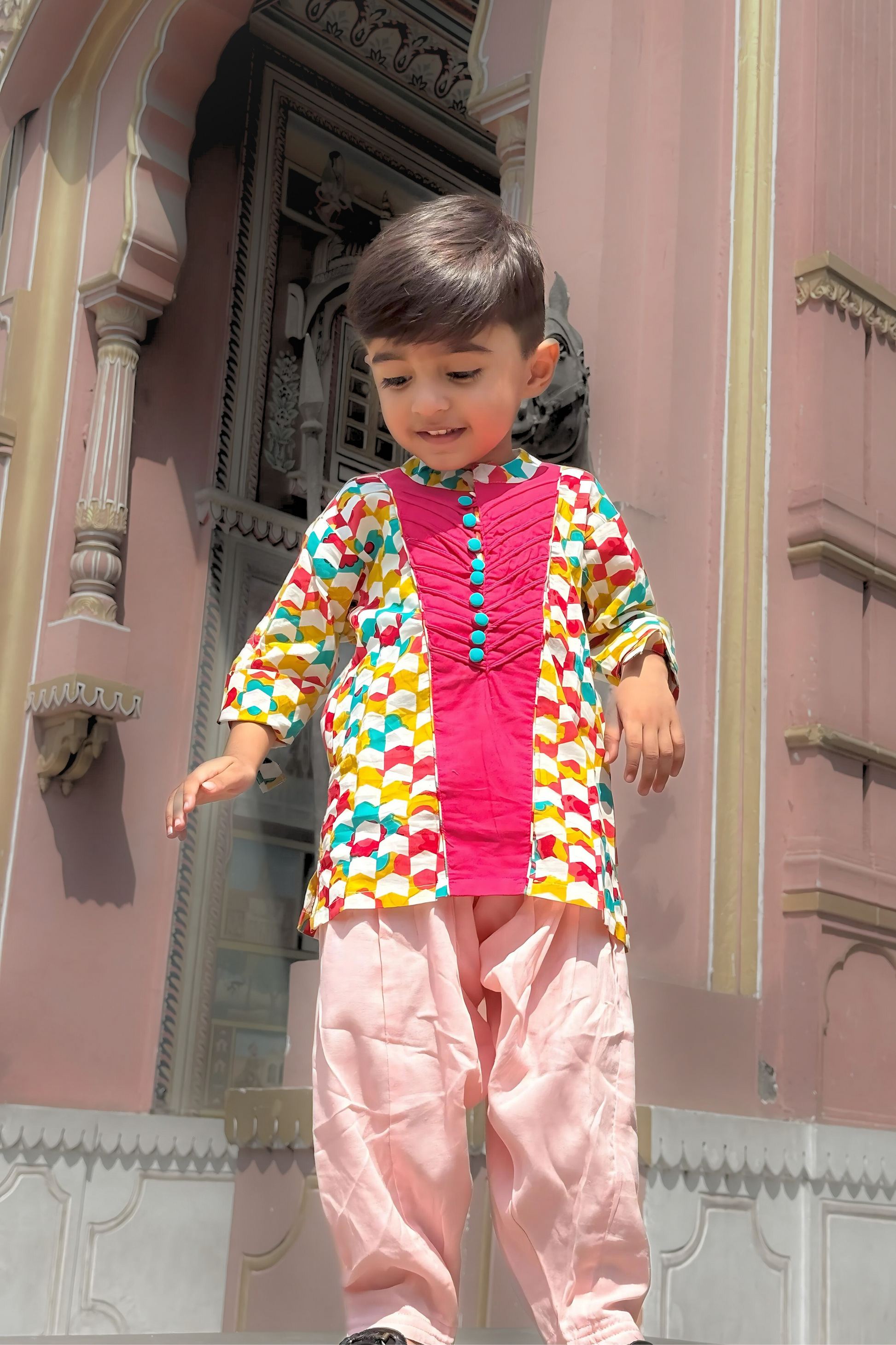 Elevate your little one's ethnic wardrobe with our Boys Afghani Color Block Short Kurta with Salwaar Set in Pink. Crafted with intricate handwork, this afghani style outfit boasts a beautiful solid and print combination, accented with dori detailing. Made from 100% soft cotton fabric, it comes with a comfortable mulmul salwaar and a unique, eye-catching design. A perfect blend of luxury and comfort for your stylish little one.