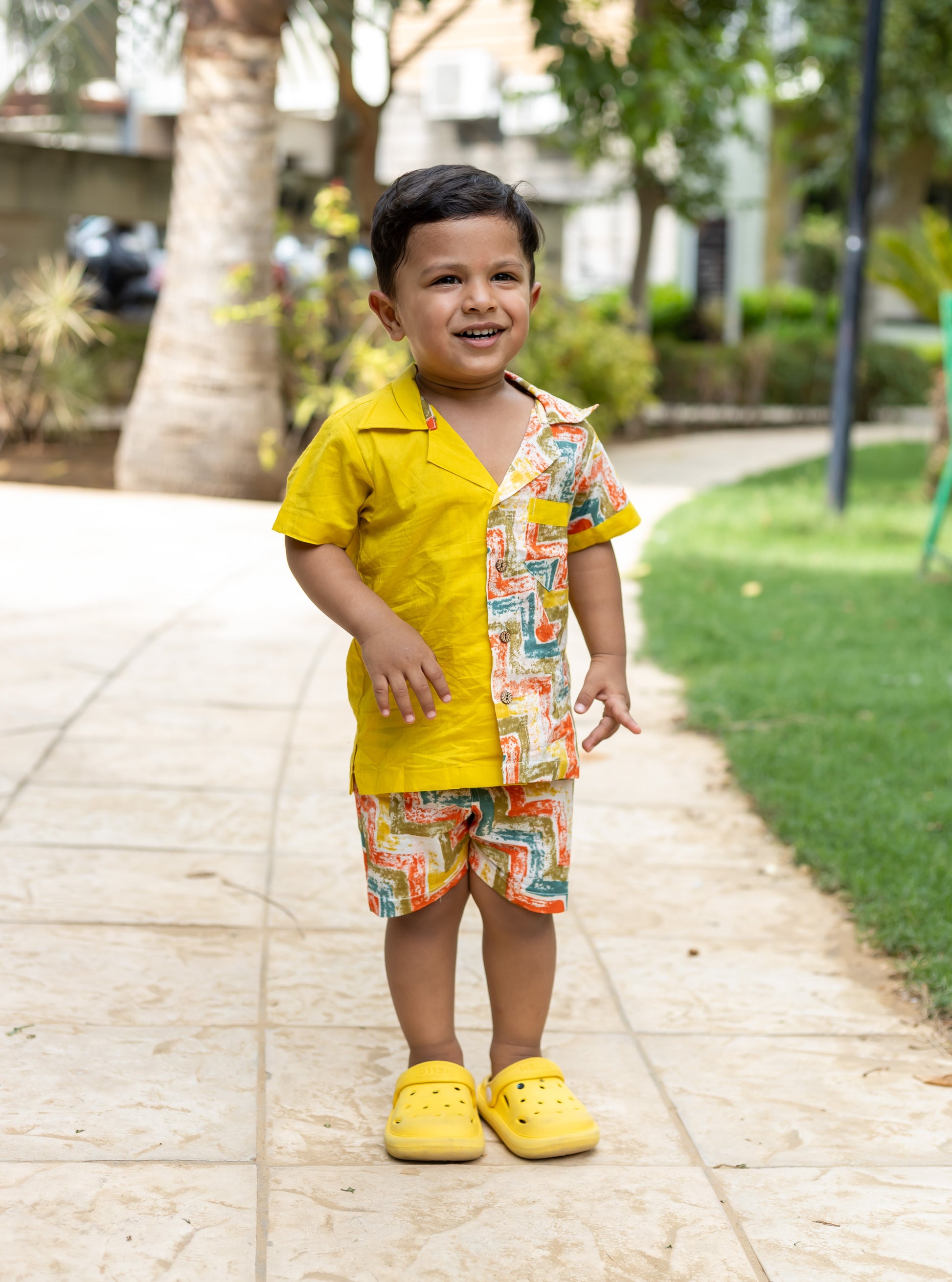 Outfit your little kid for the bright days ahead with this Boys Amazon Pure Cotton Clothing Set! Crafted from 100% cotton natural material, it features a stylish mix of solid mustard and multicolor geometric printed fabrics, plus comfortable elastic shorts for playdates, outdoor escapades, and shopping sprees. Get your boys style game on point with this perfect combo!