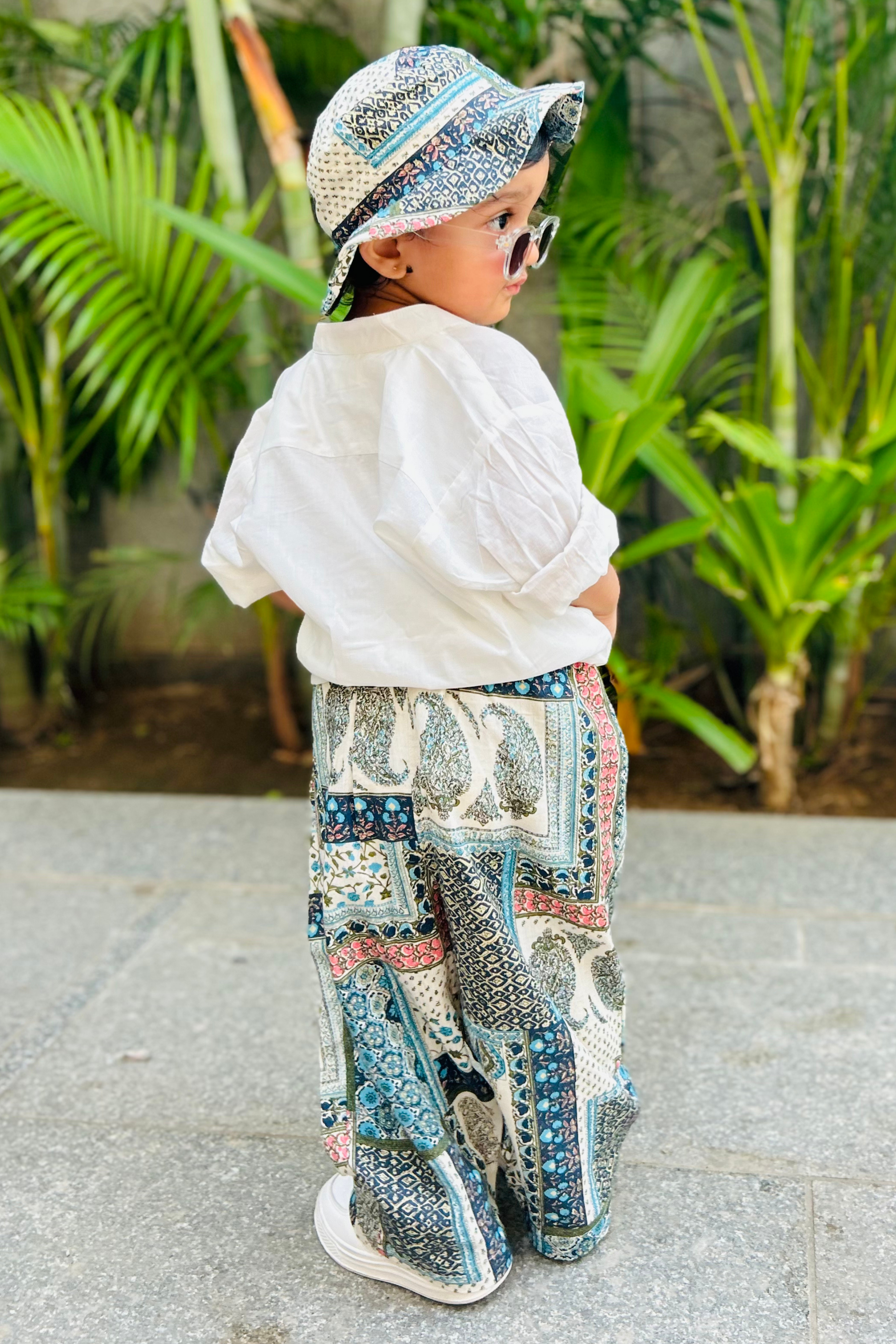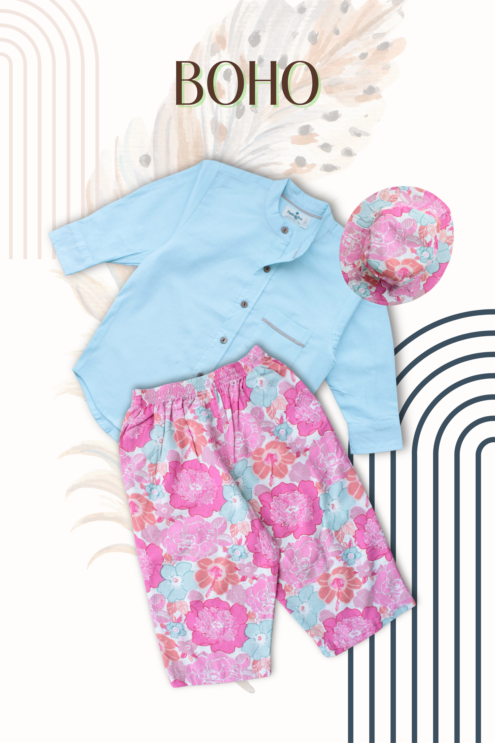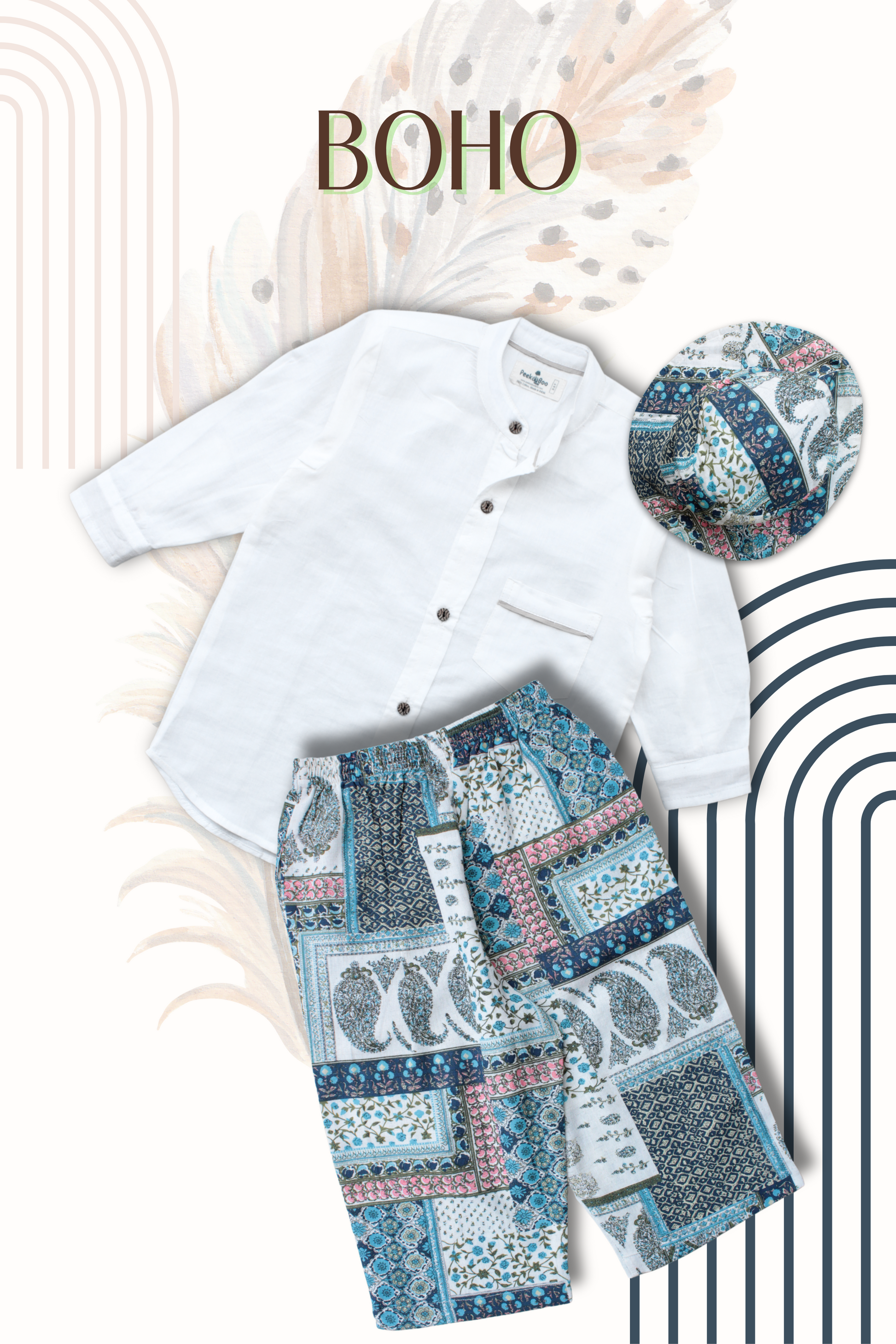 Elevate your little one's style with our Boys Boho Resort Wear Set. This printed pajama set exudes a boho vibe, perfect for a luxurious getaway. Made with 100% super soft cotton, the white shirt will feel like a second skin. Choose between a linen blend shirt with floral pajamas or a solid white shirt with paisley print pajamas.