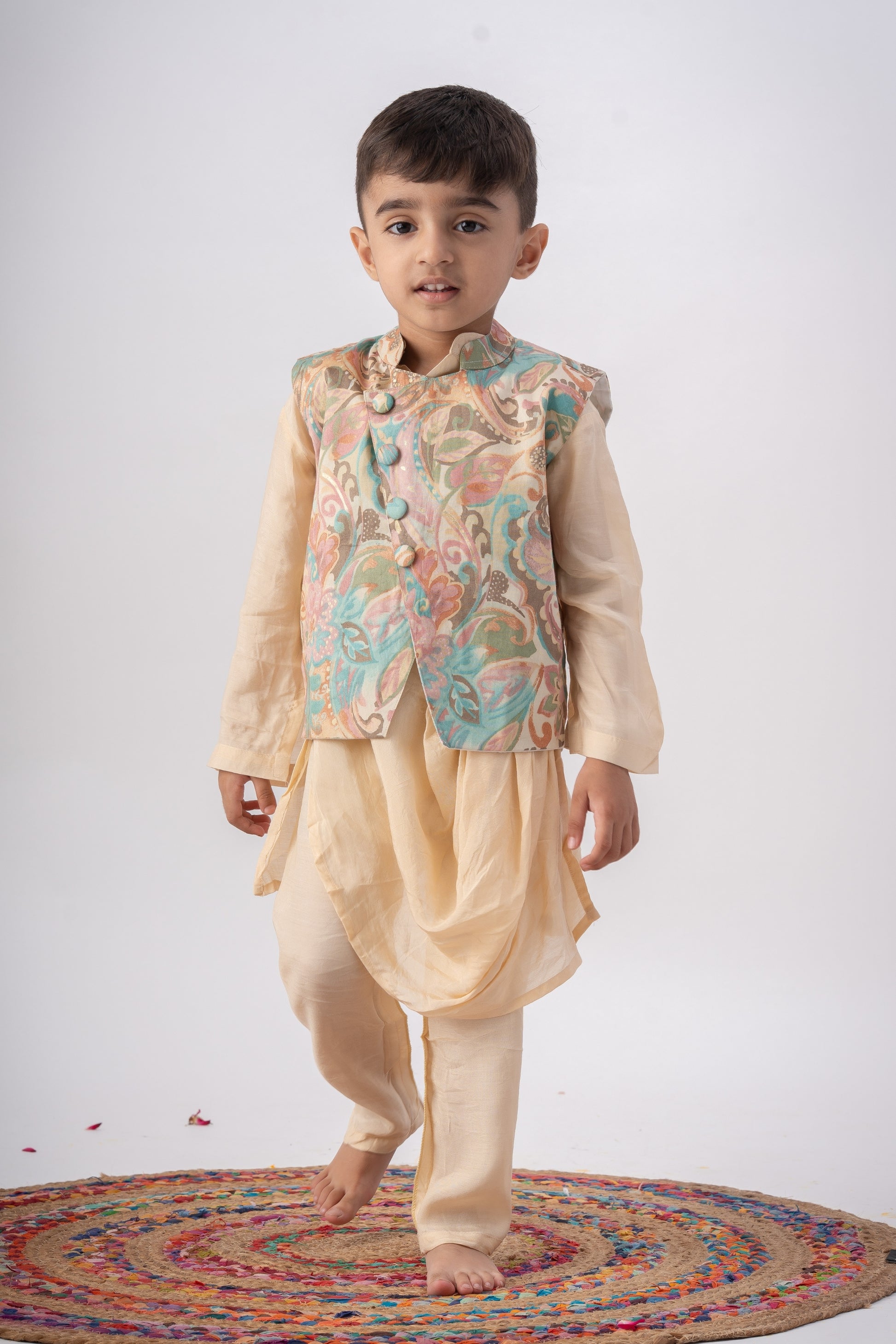 Boys Nawaab Silk Cowl Kurta Set with Bundi - Ivory