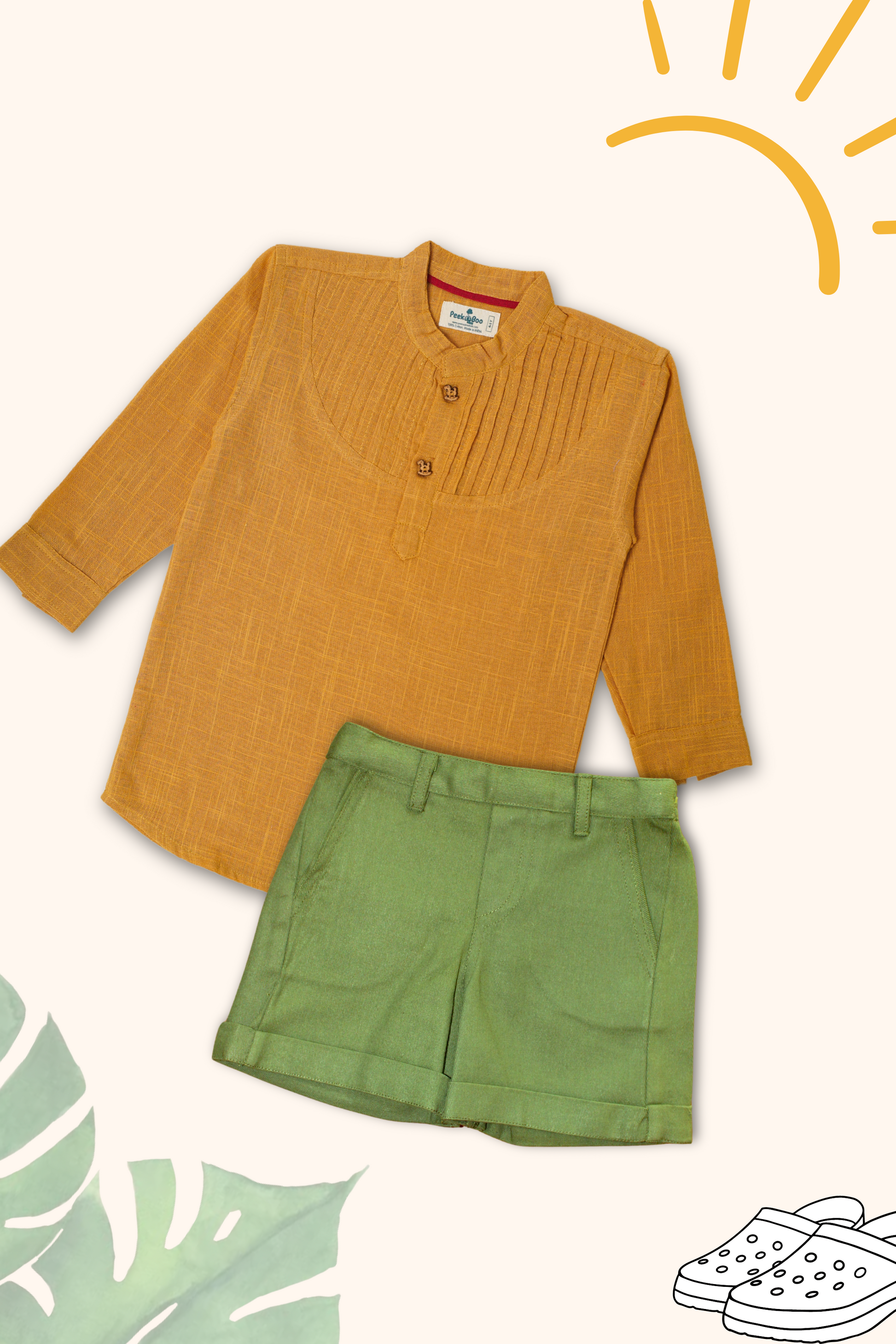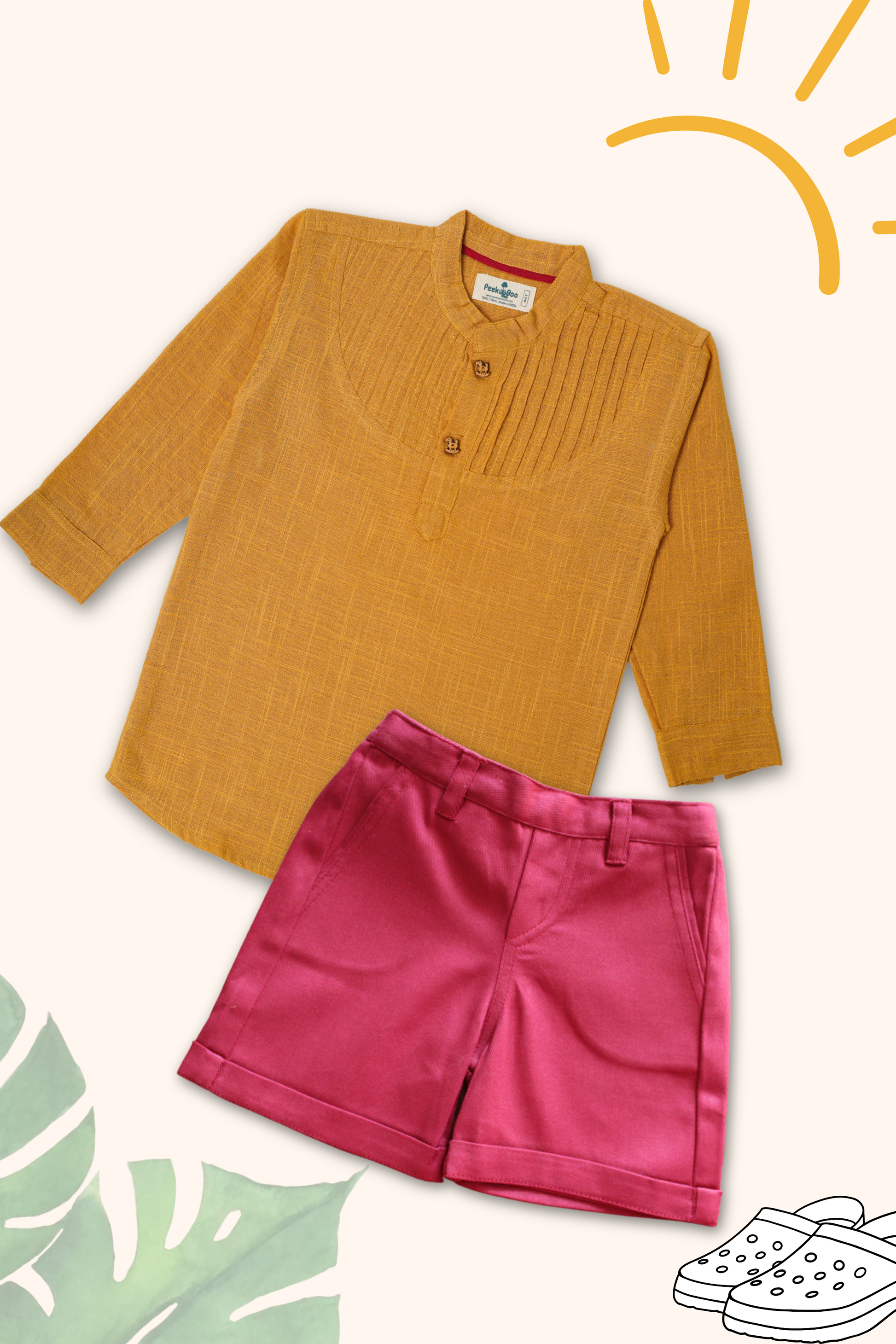 Get your little guy ready for the sunny season with this Boys Pure Cotton Clothing Set! Made from 100% natural material, it includes a red shirt with pintuck detailing and quirky wooden buttons, and shorts with a belt and elastic for a perfect fit available in Olive & Tan color. Perfect for playdates, outdoor adventures, and mall trips!