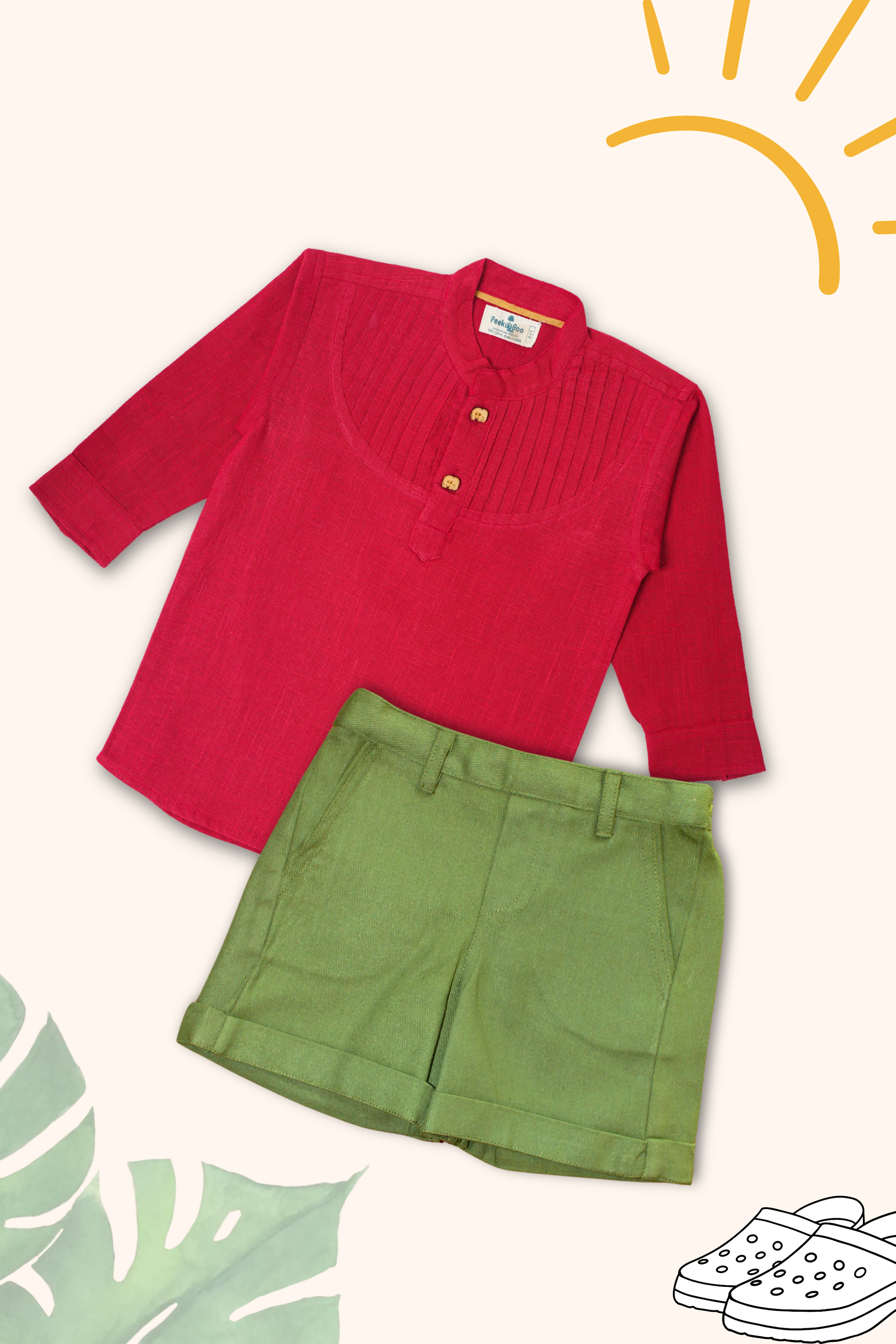 Get your little guy ready for the sunny season with this Boys Pure Cotton Clothing Set! Made from 100% natural material, it includes a red shirt with pintuck detailing and quirky wooden buttons, and shorts with a belt and elastic for a perfect fit available in Olive & Tan color. Perfect for playdates, outdoor adventures, and mall trips!