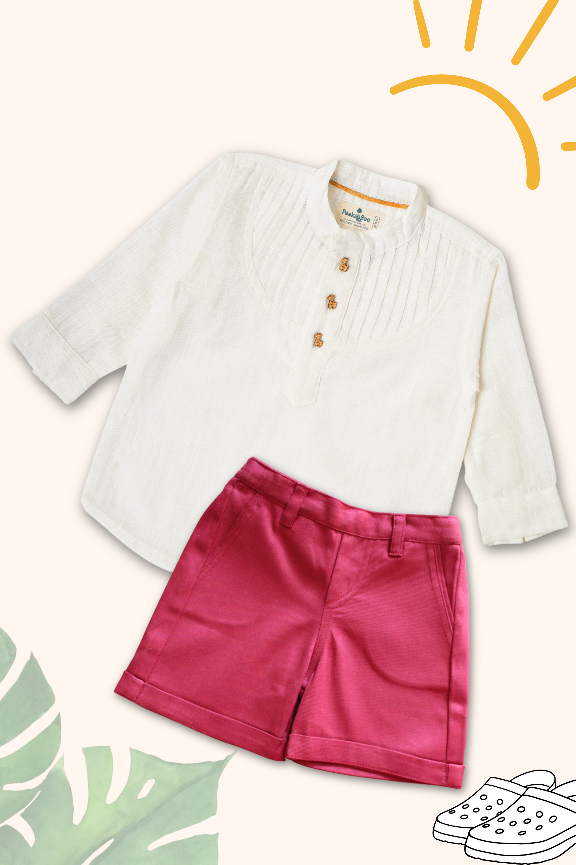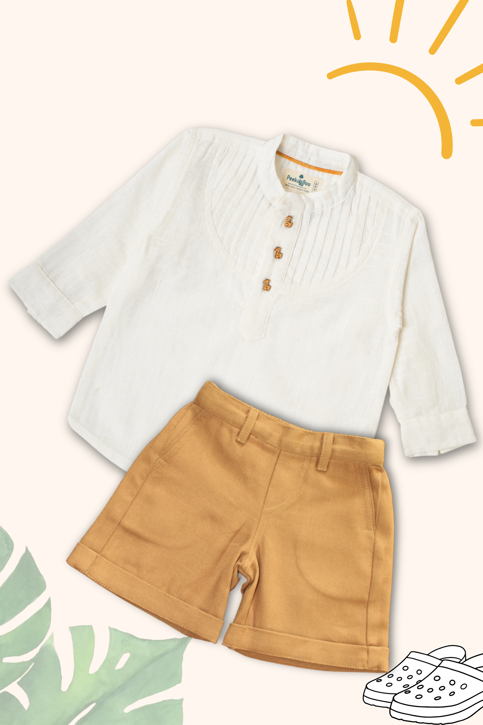 Get your little guy ready for the sunny season with this Boys Pure Cotton Clothing Set! Made from 100% natural material, it includes a white shirt with pintuck detailing and quirky wooden buttons, and shorts with a belt and elastic for a perfect fit available in Olive, Marron & Tan color. Perfect for playdates, outdoor adventures, and mall trips!