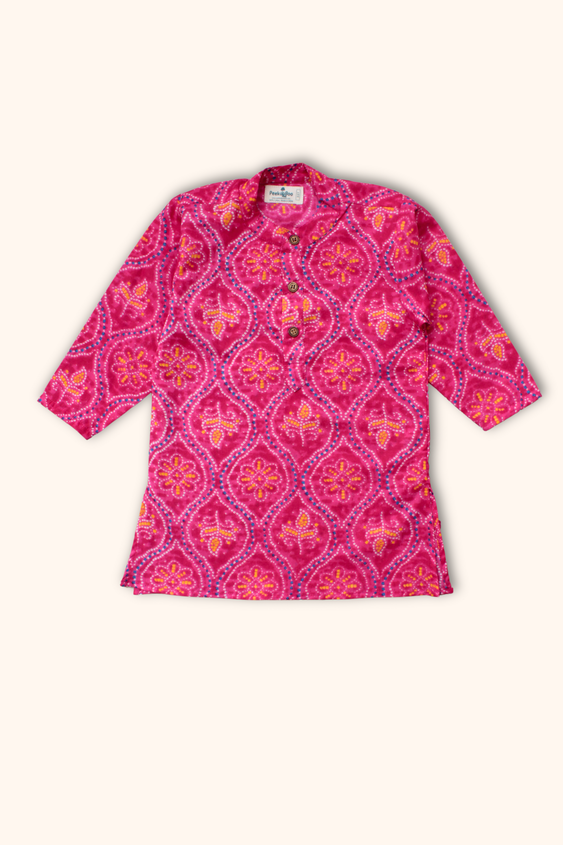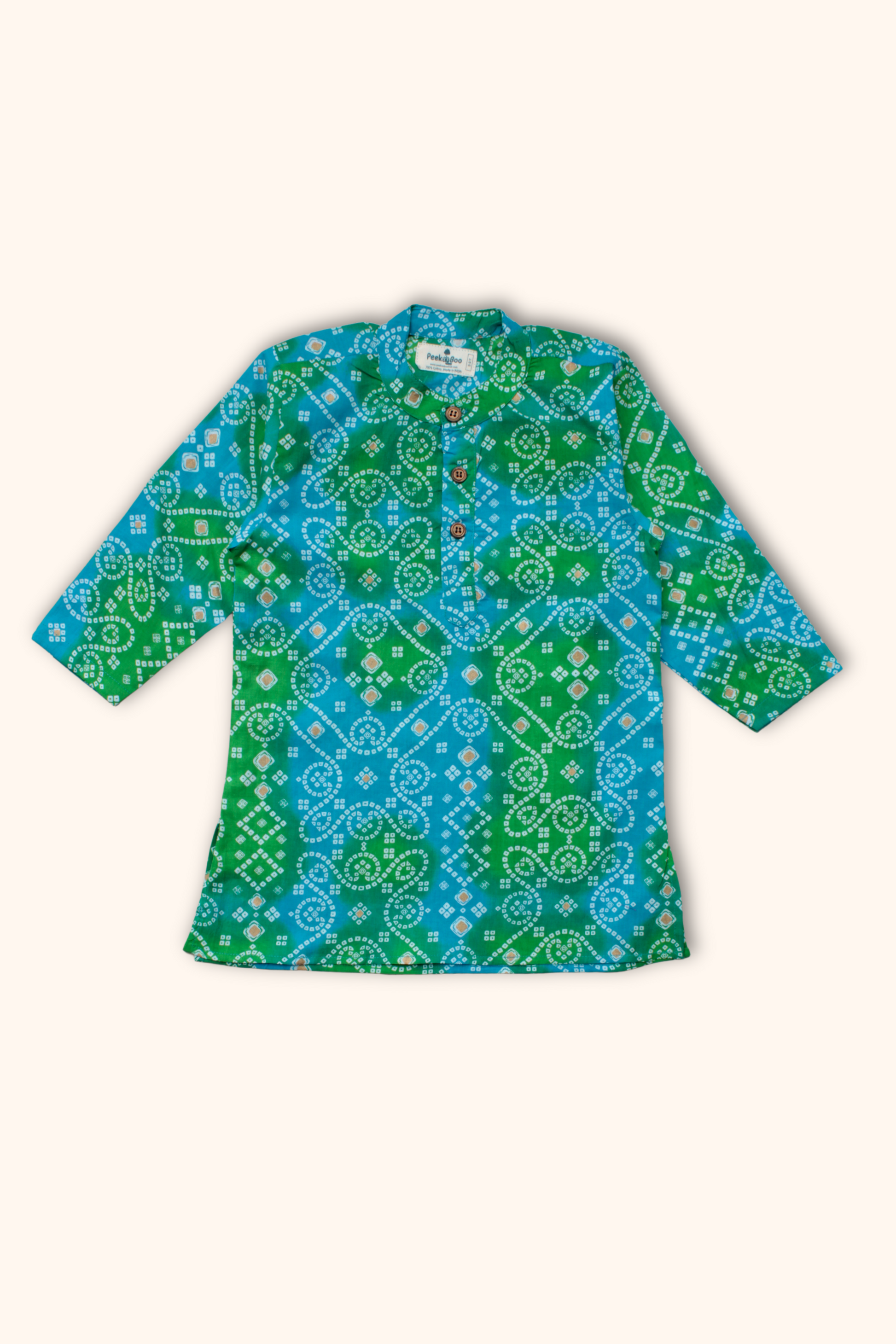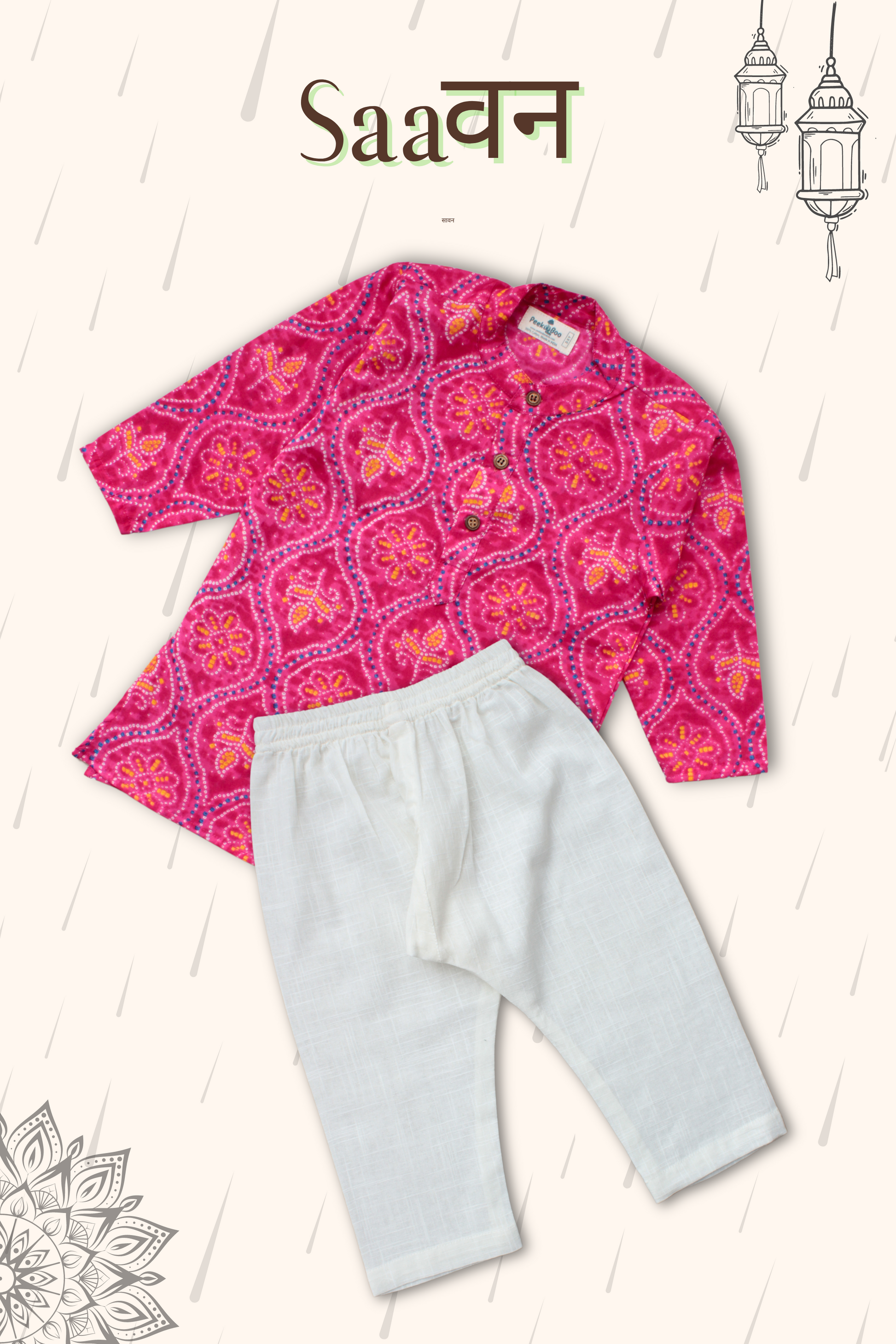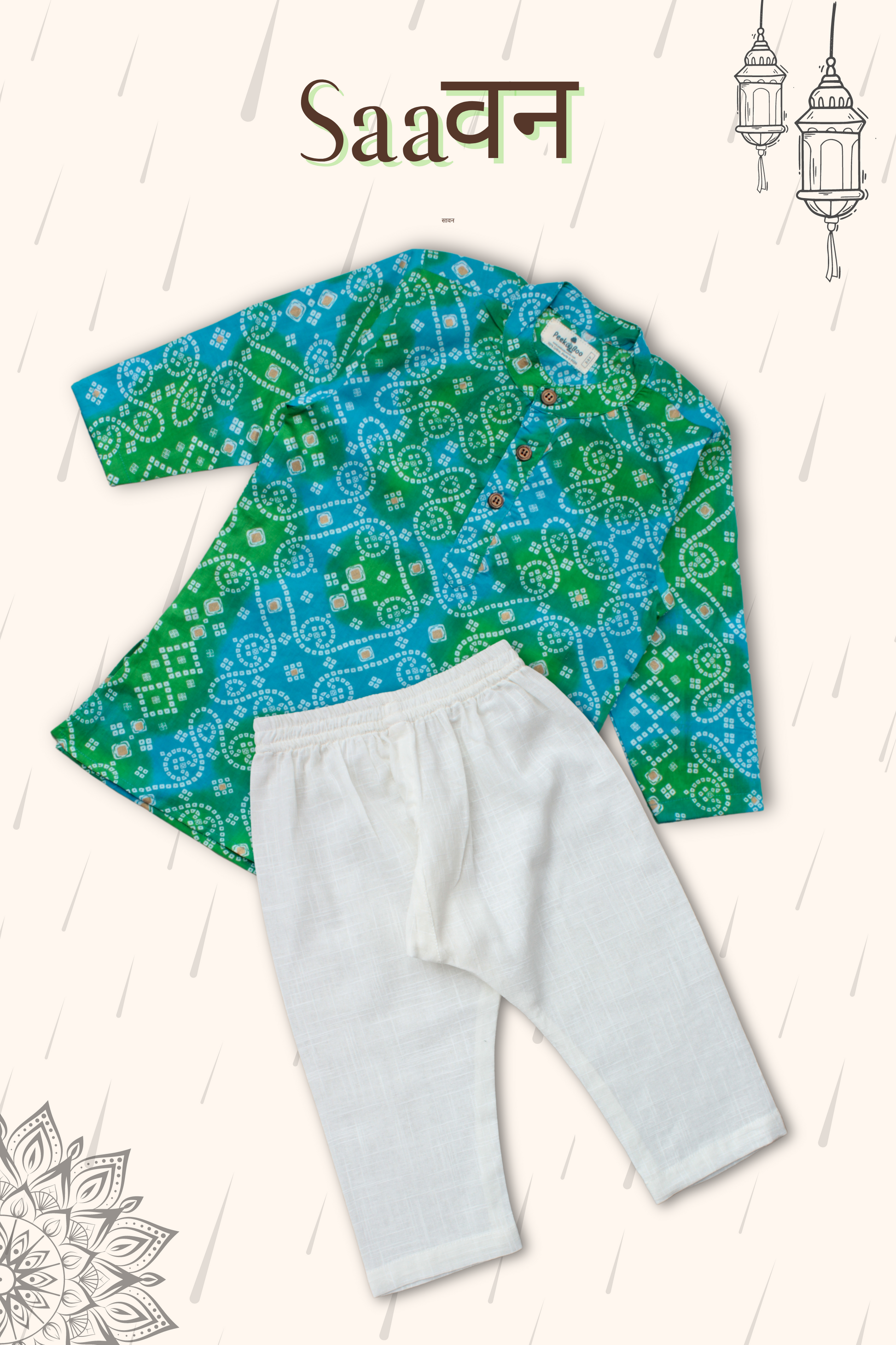 Introducing our limited edition Boys Saavan Pure Cotton Ethnic Clothing set, perfect for Rakhi and Navratri. Made with soft cotton in a traditional leheriya and bandhej print - a popular art from in Rajasthan, this saavan collection is a must-have for any fashion-forward young boy. Elevate his style with this exclusive ethnic wear.
