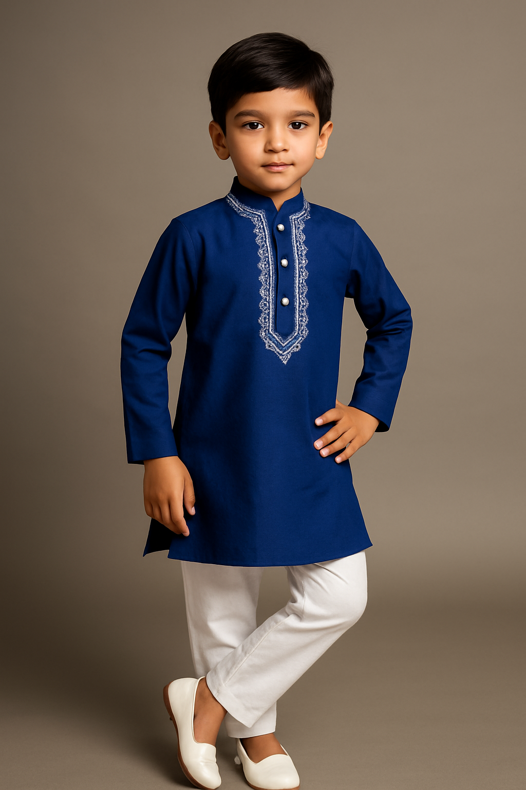 Indulge in luxury with our Boys Tyohaar Kurta and Pajami set. Hand embroidered collar line and peach finish cotton poplin fabric offer a soft, luxurious feel. With its minimalistic style and gold button detailing, this set is perfect for a sophisticated and stylish look. Available in smart colors, perfect for any occasion.