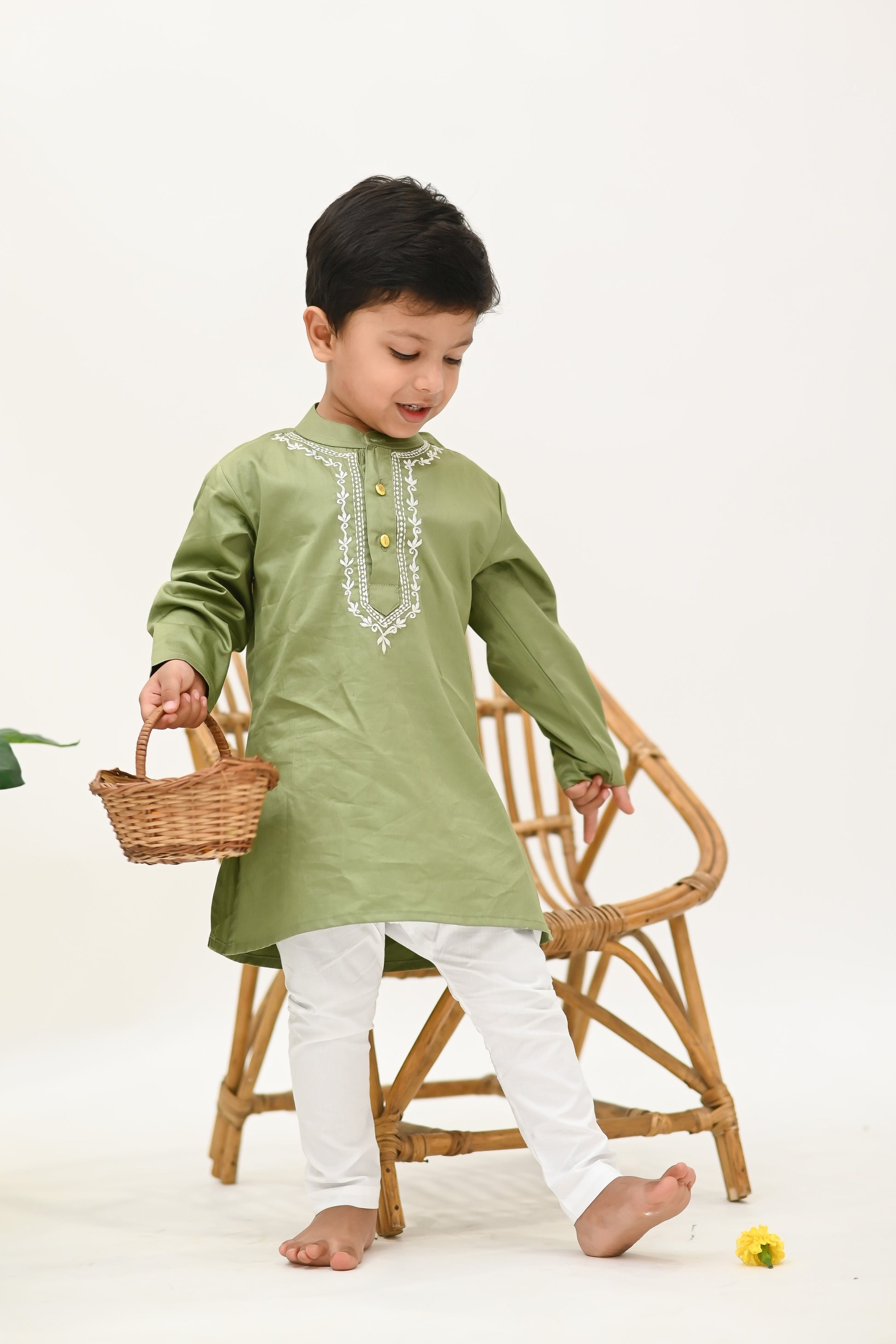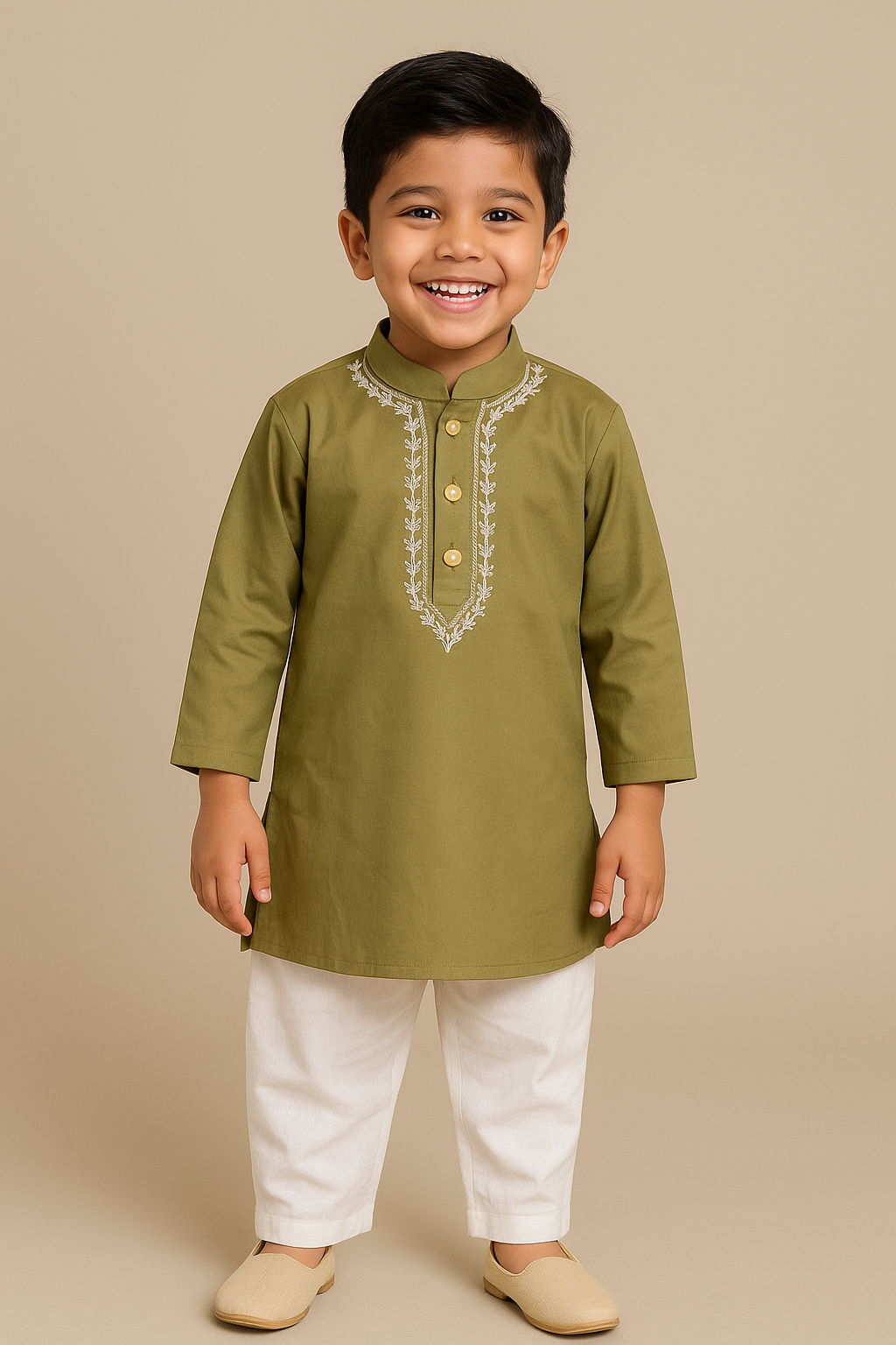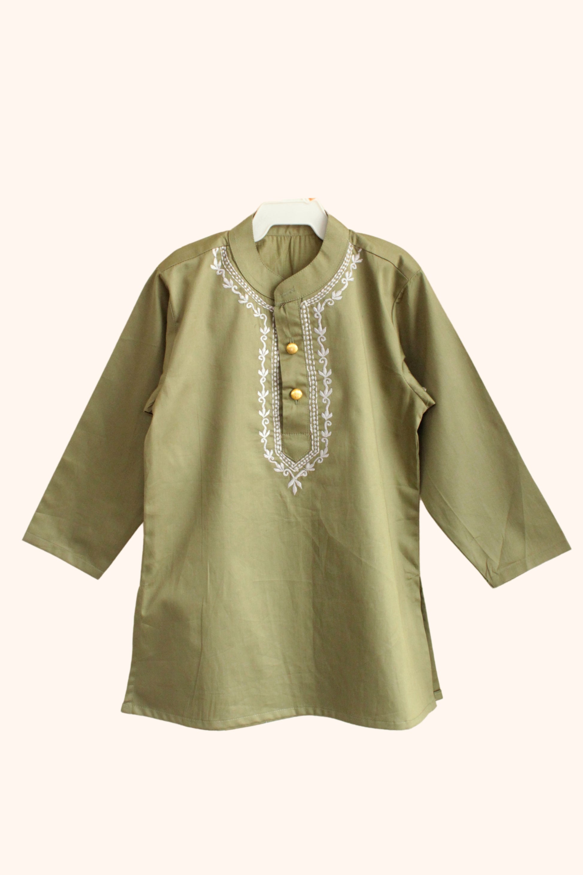 Indulge in luxury with our Boys Tyohaar Kurta and Pajami set. Hand embroidered collar line and peach finish cotton poplin fabric offer a soft, luxurious feel. With its minimalistic style and gold button detailing, this set is perfect for a sophisticated and stylish look. Available in smart colors, perfect for any occasion.