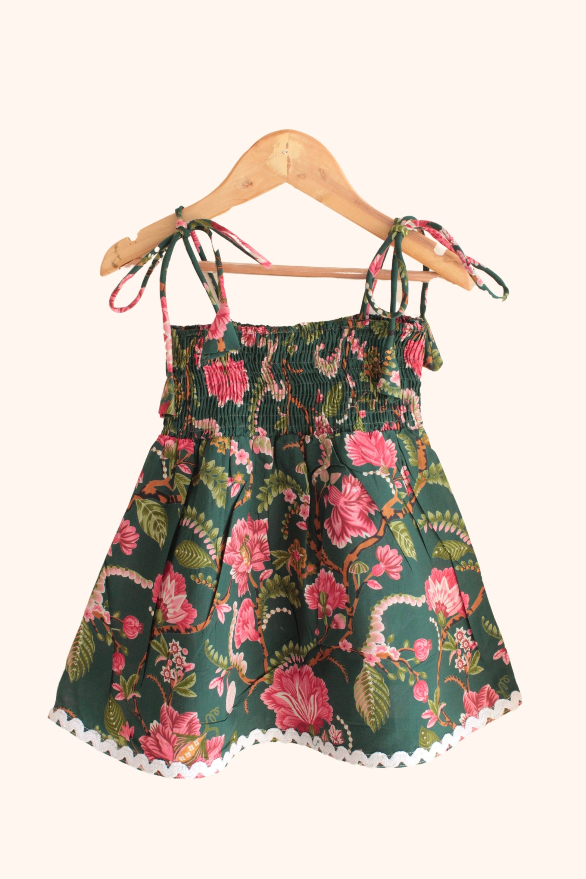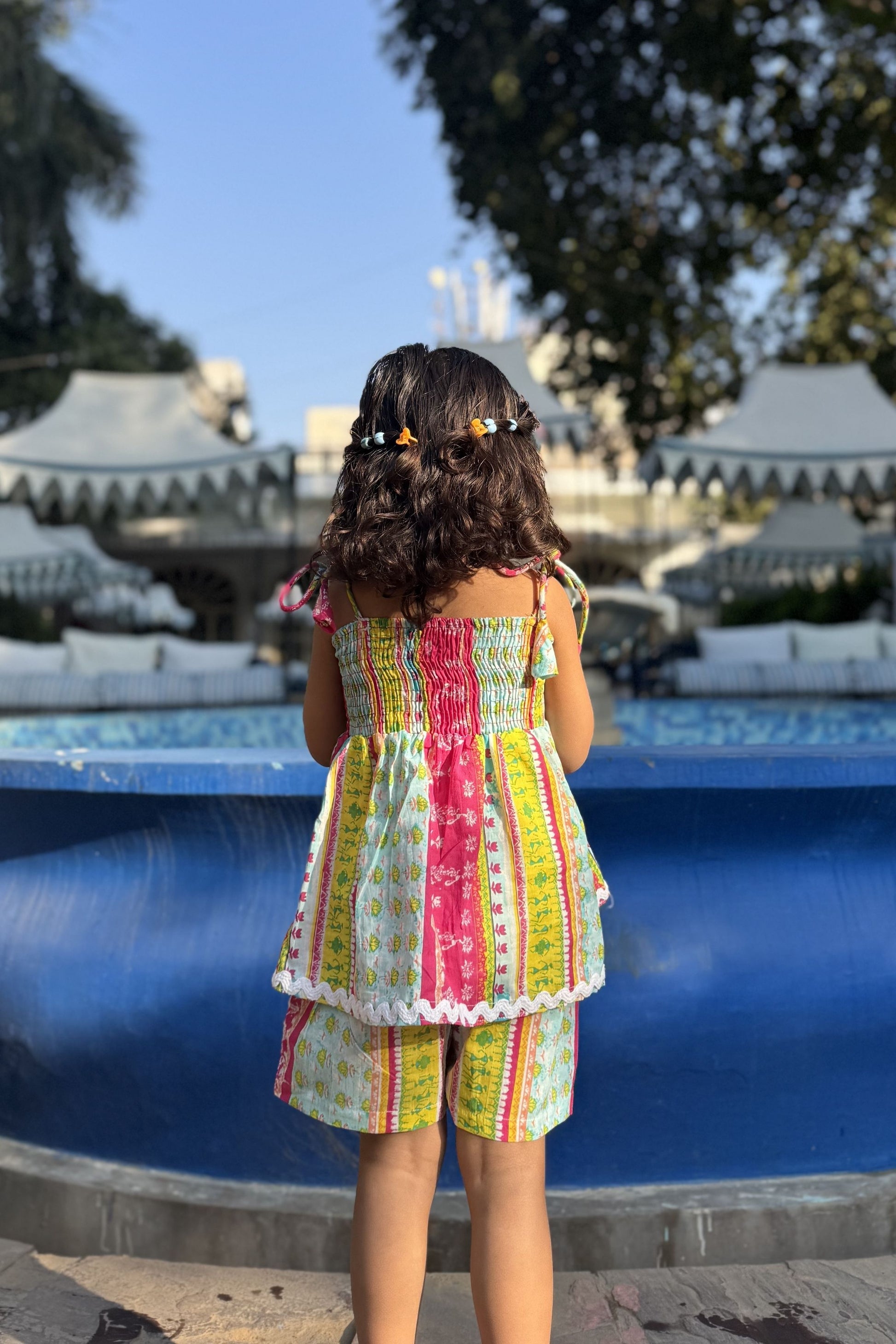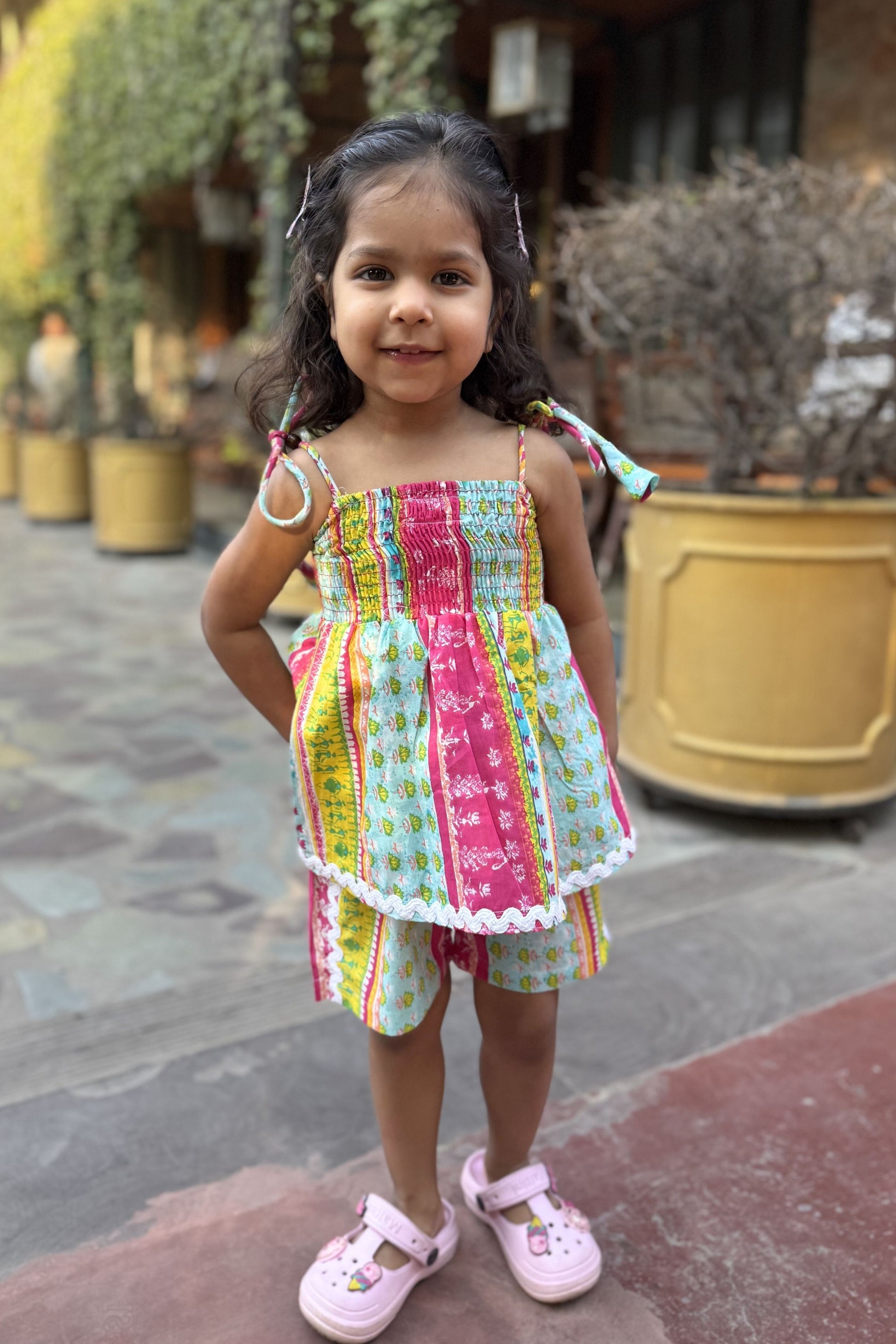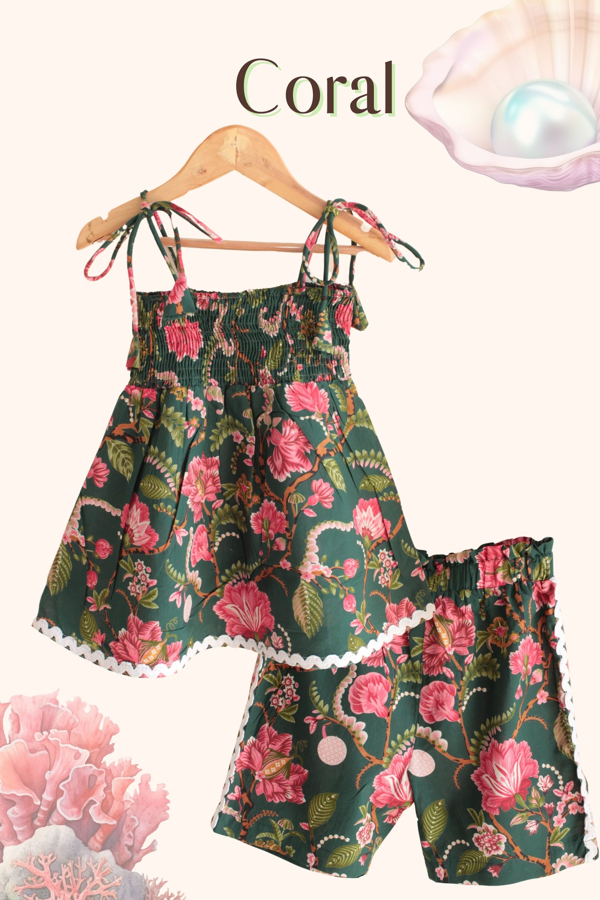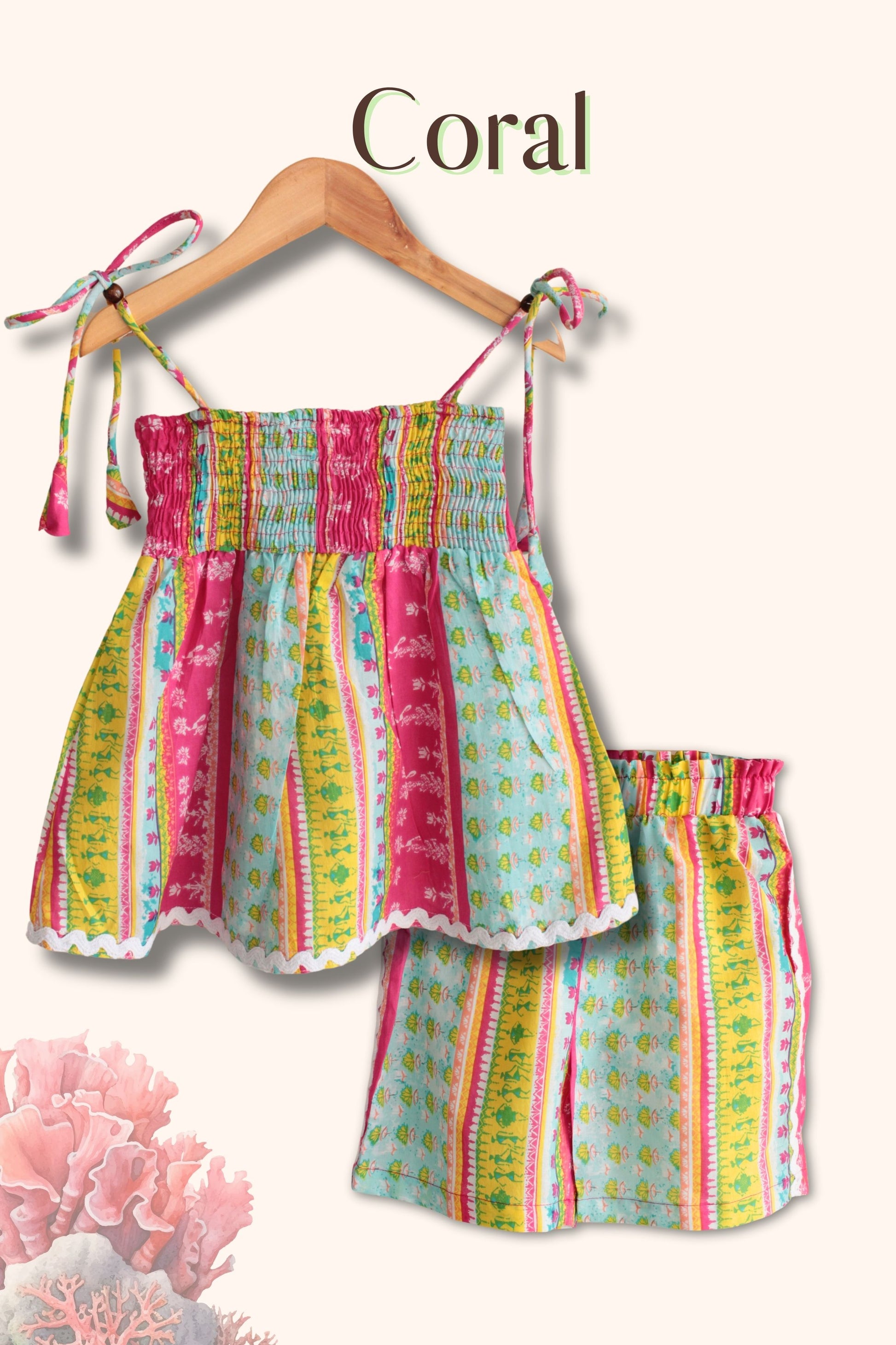 Inspired by the beauty and vibrance of coral reefs, this breezy outfit captures the essence of a tropical getaway with its refreshing hues and relaxed silhouette. Featuring adjustable shoulder straps for the perfect fit and smocking on the chest for added comfort, it’s the ultimate vacation-ready ensemble for your little fashionista!