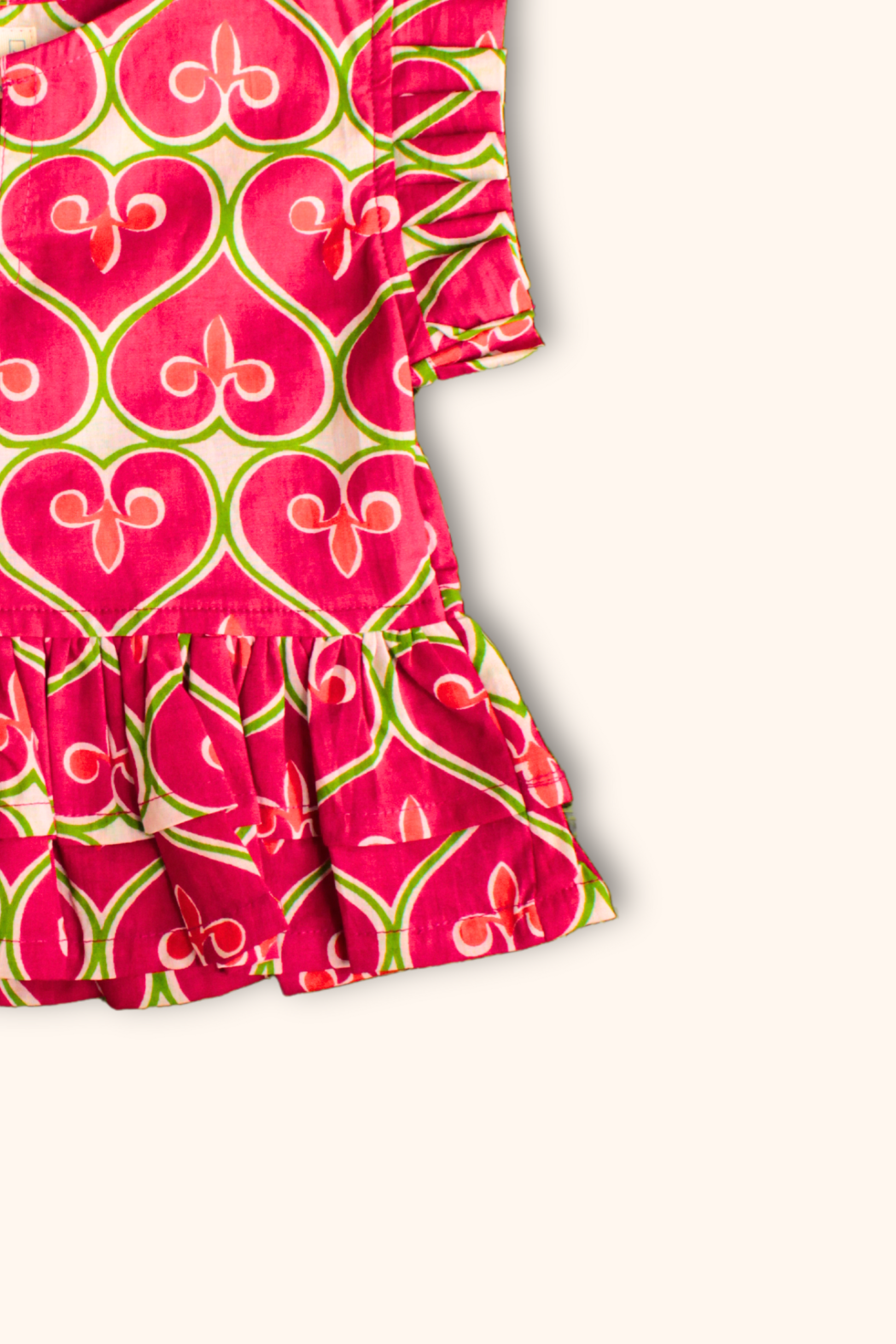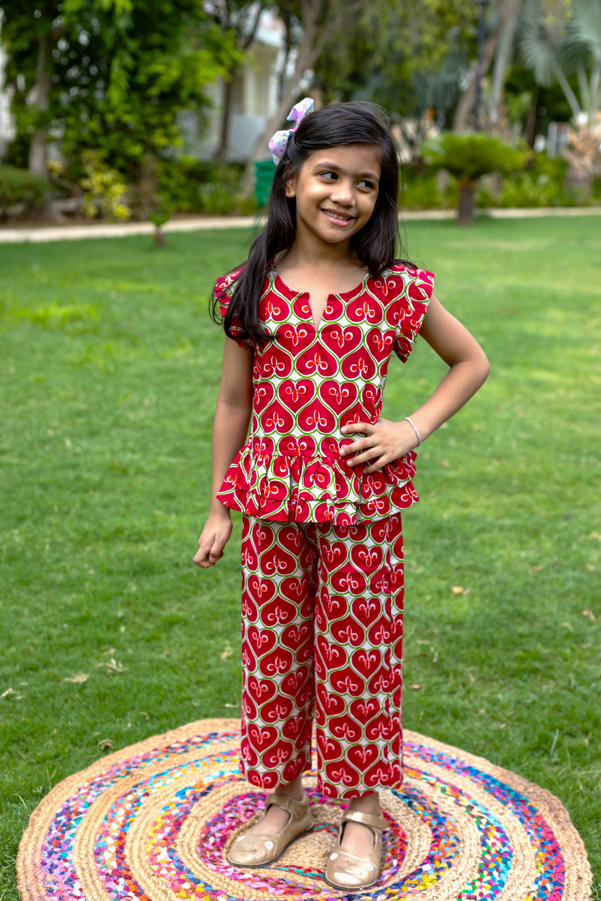 Add some flair to your little girl's wardrobe with our Girls Husn Pure Cotton Clothing Set in Cherry Red. This set includes a stylish top and wide leg palazzo pants, perfect for a comfortable and trendy look. Don't miss out on this all hearts printed co-ord set that is sure to turn heads!