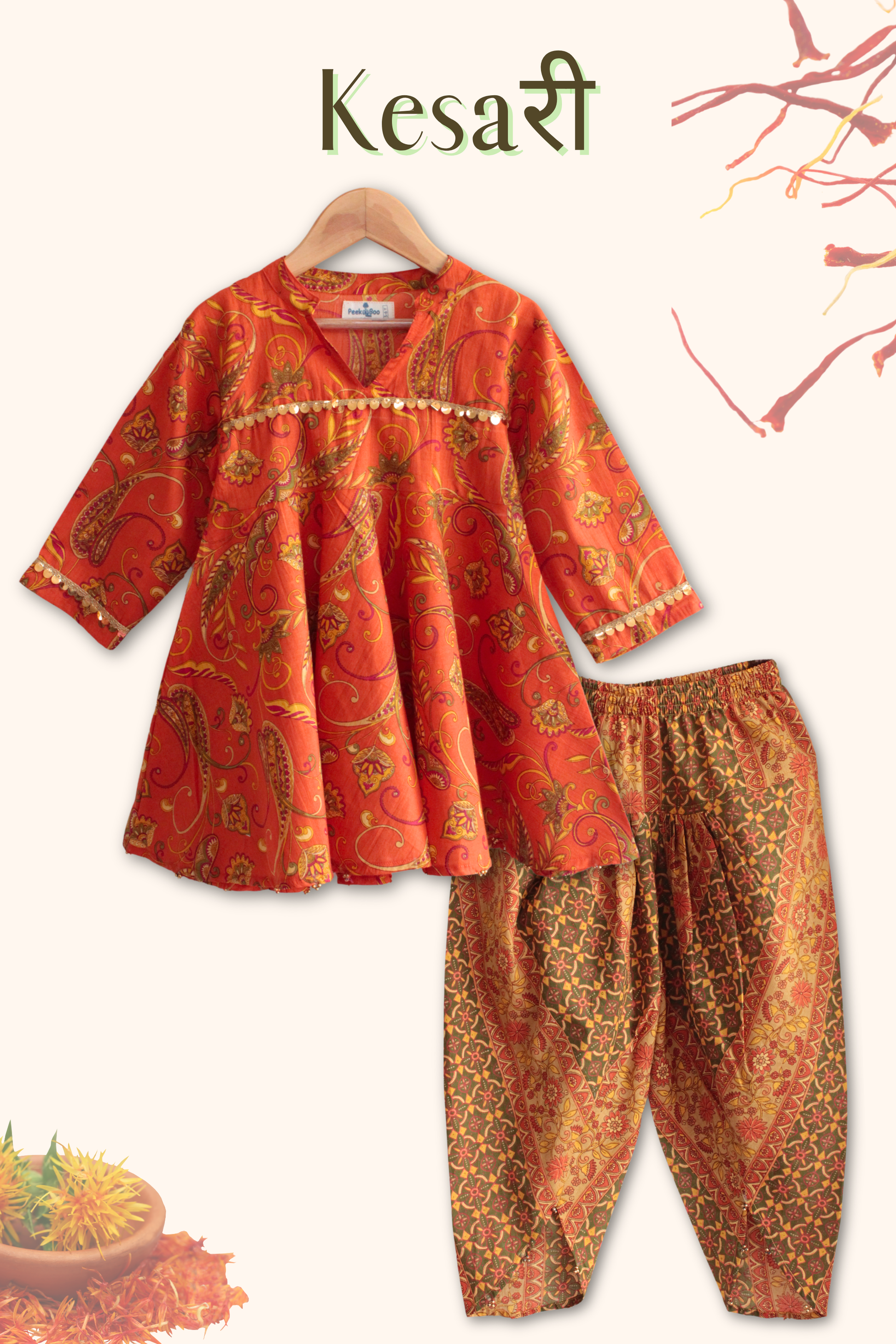 Brighten your little one's wardrobe with this vibrant purple Kesari Pure Cotton Ethnic Set! This playful outfit features eye-catching prints, intricate lace details, and beautiful handwork along the hemline. The fit and flare pattern creates a twirl-worthy silhouette that's both comfortable and stylish. Perfect for festivals, family gatherings, or anytime your little girl wants to showcase her unique cultural style!