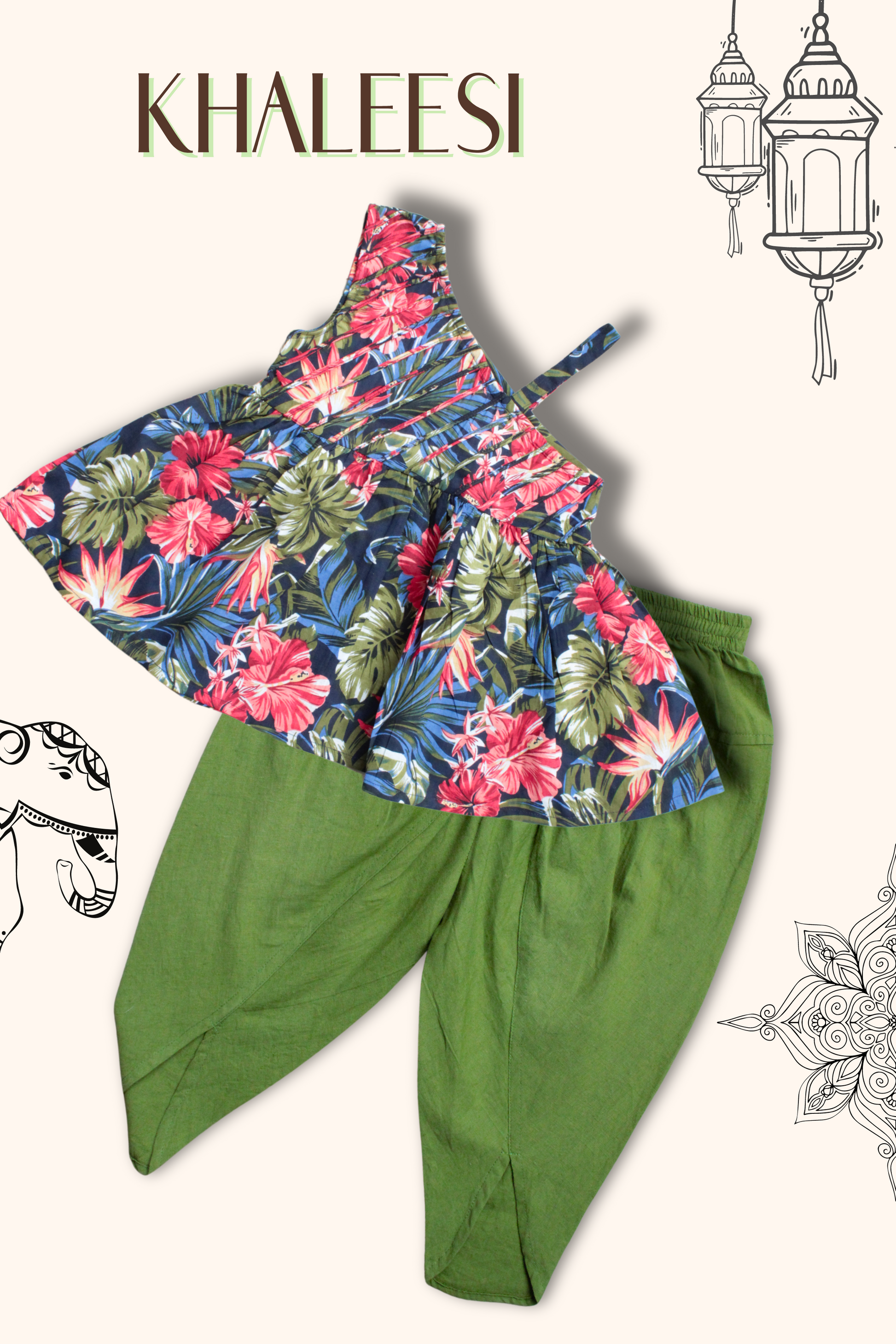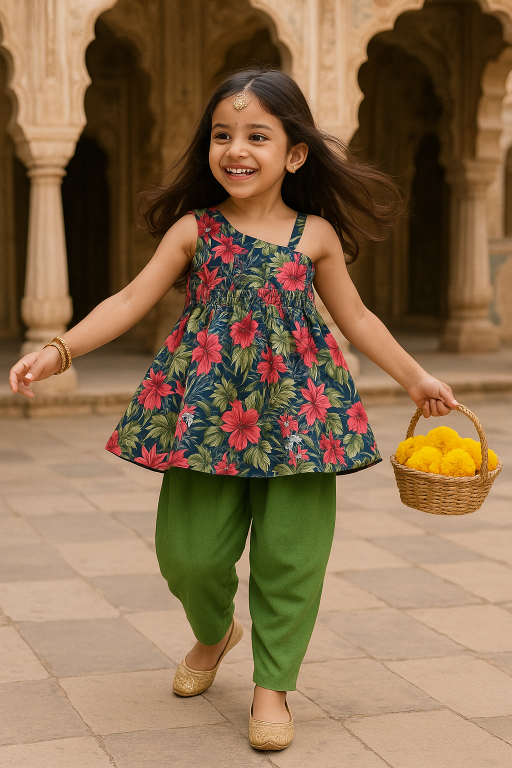 Elevate your little one's wardrobe with our Girls Khaleesi Pure Cotton Ethnic Clothing set in Green. Featuring a vibrant multicolor print and a unique design, this must-have outfit exudes luxury. Crafted from incredibly soft cotton fabric and complemented by comfortable tulip pants, this set is a sophisticated and exclusive choice for the festive season, perfect for Rakhi or Navratri.