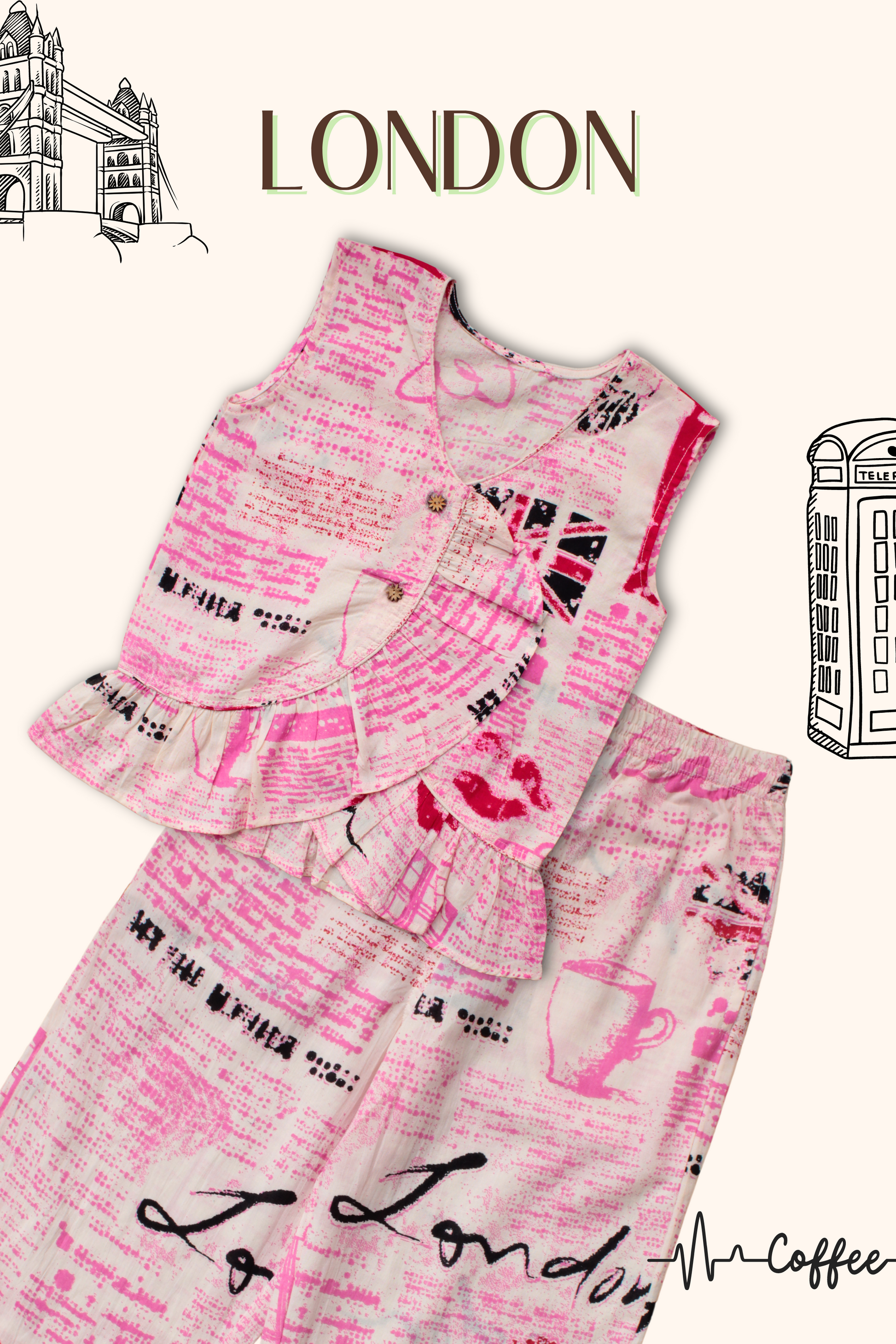 Indulge in luxury with our Girls London Pure Cotton Clothing set in Pink. The vibrant London print and unique design make this must-have outfit a statement piece in your little one's wardrobe. Made from super soft cotton fabric, with comfortable palazzo pants, she'll love wearing this exclusive set.