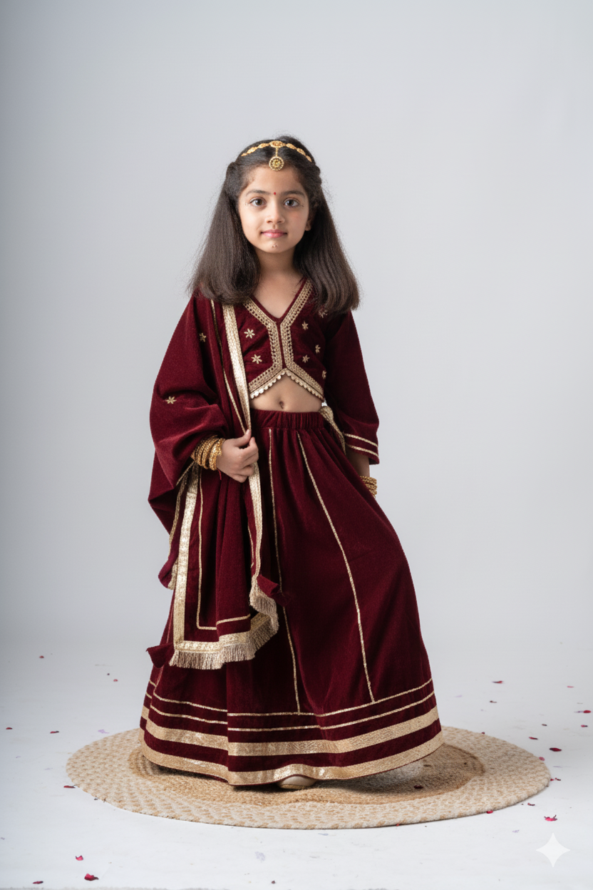 Introducing our Girls Maharani Velvet Lehenga Choli—a masterpiece of understated elegance designed for the discerning eye. Hand-embroidered with intricate detailing, this maroon ensemble captures regal sophistication without overwhelming ornamentation. The luxurious velvet fabric drapes beautifully, perfect for winter weddings and festive celebrations. Paired with a coordinating dupatta, this three-piece set strikes the ideal balance between minimalist design and grand appeal. Available in matching styles for boys, creating the perfect twinning moment for siblings. Elevate your child's ethnic wardrobe with timeless grace and refined craftsmanship.