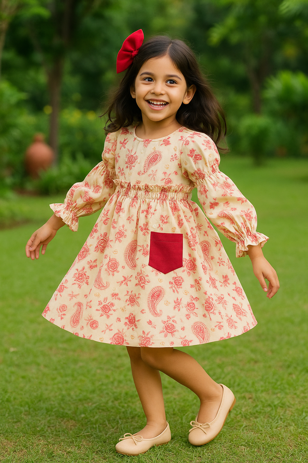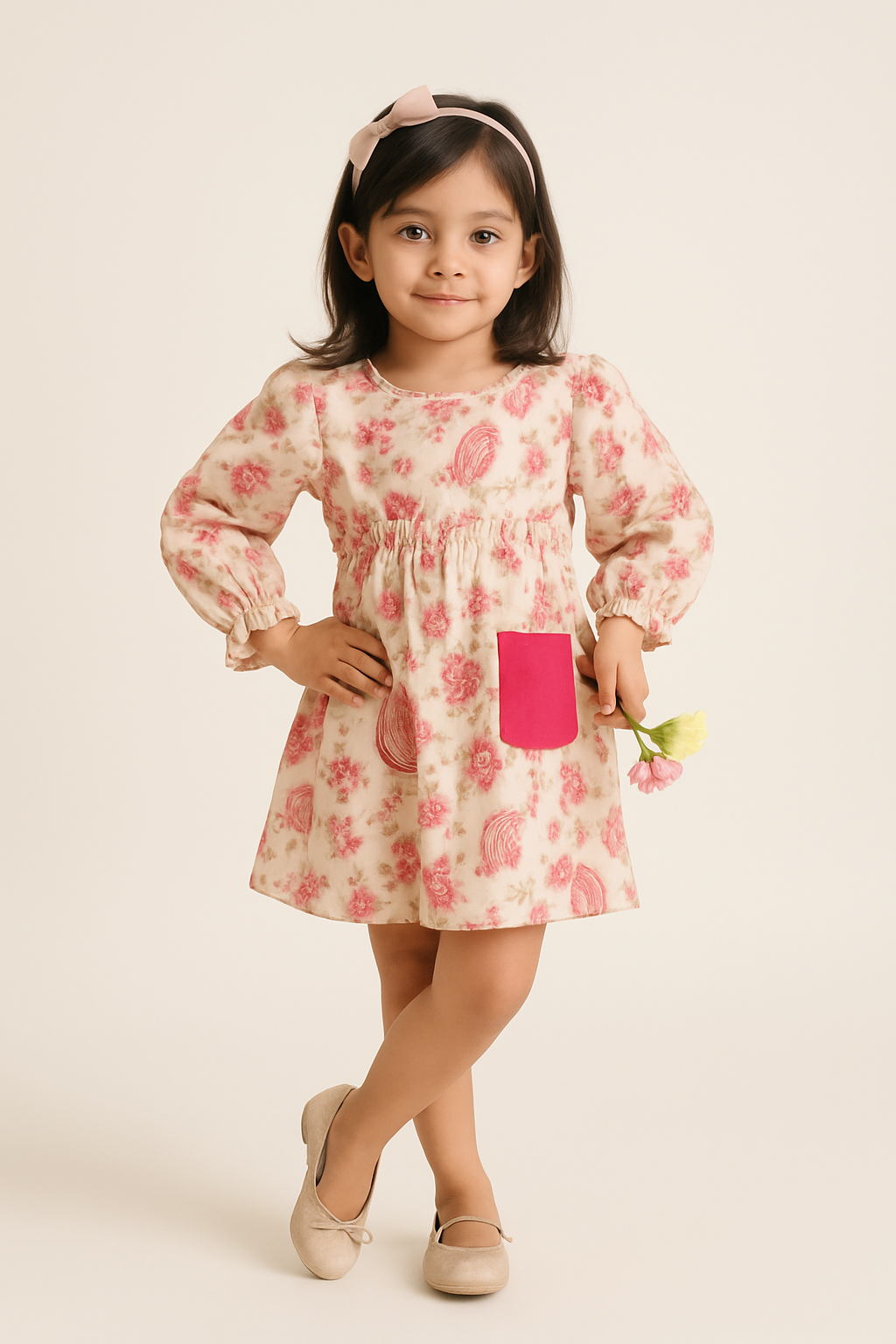 This elegant dress features soft mulmul cotton with a delicate print, designed with a keyhole and button closure at the back of the neck. It has long sleeves with subtle elastic detailing at the cuffs and elbows, and a gathered, elasticized seam across the chest. The asymmetrical silhouette is enhanced by a charming pink patch, adding a refined touch to the off-white base.