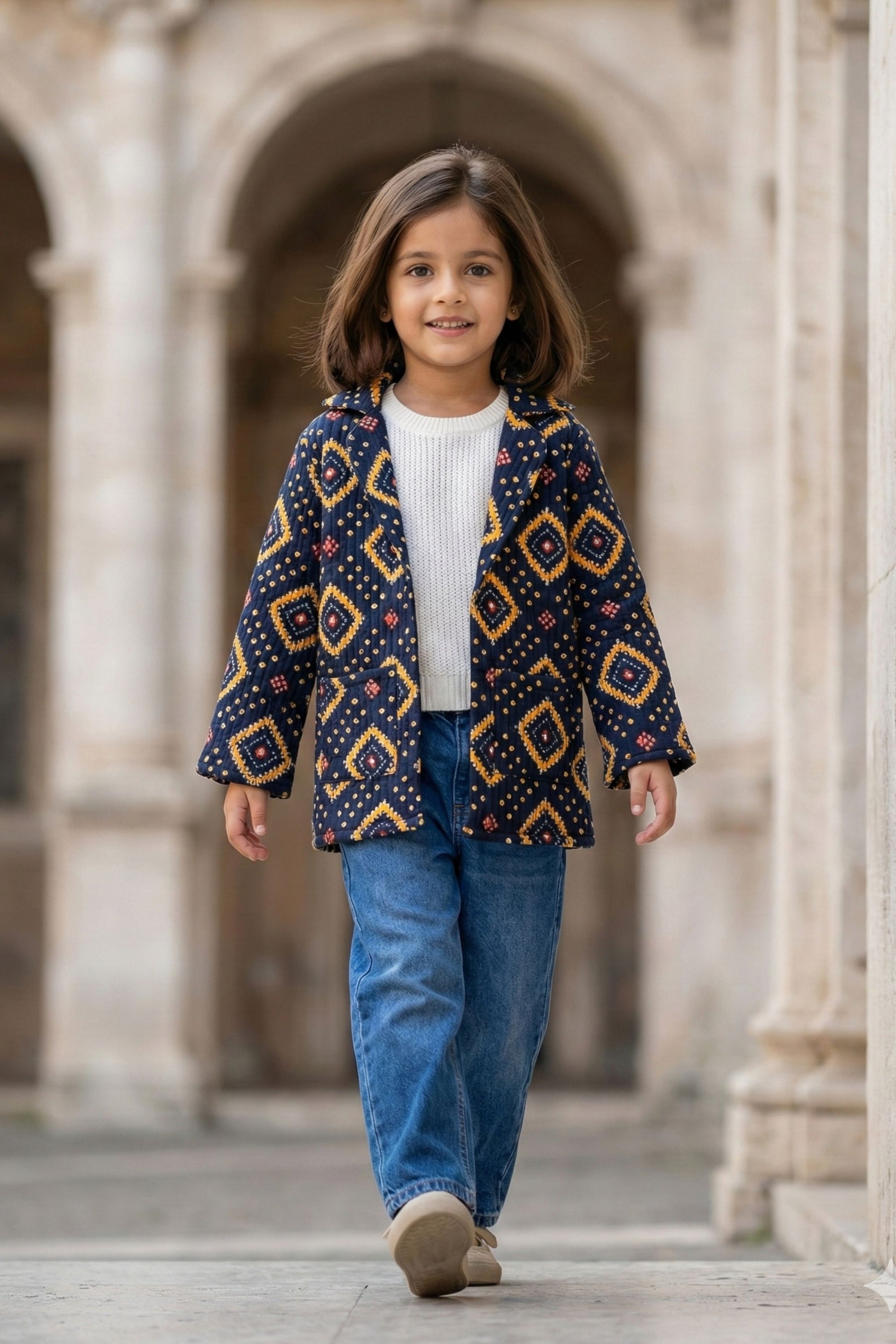Elevate your child's wardrobe with this sophisticated quilted blazer jacket, inspired by timeless old money aesthetics. Crafted from pure cotton with a refined open-front design, it features two functional front pockets and a Bandhej-printed pattern inspired from Rajasthan's heritage sets it apart. Lightweight yet warmly insulating, this piece delivers effortless style without bulk—perfect for layering or standalone wear. A versatile essential that bridges casual comfort with understated elegance.