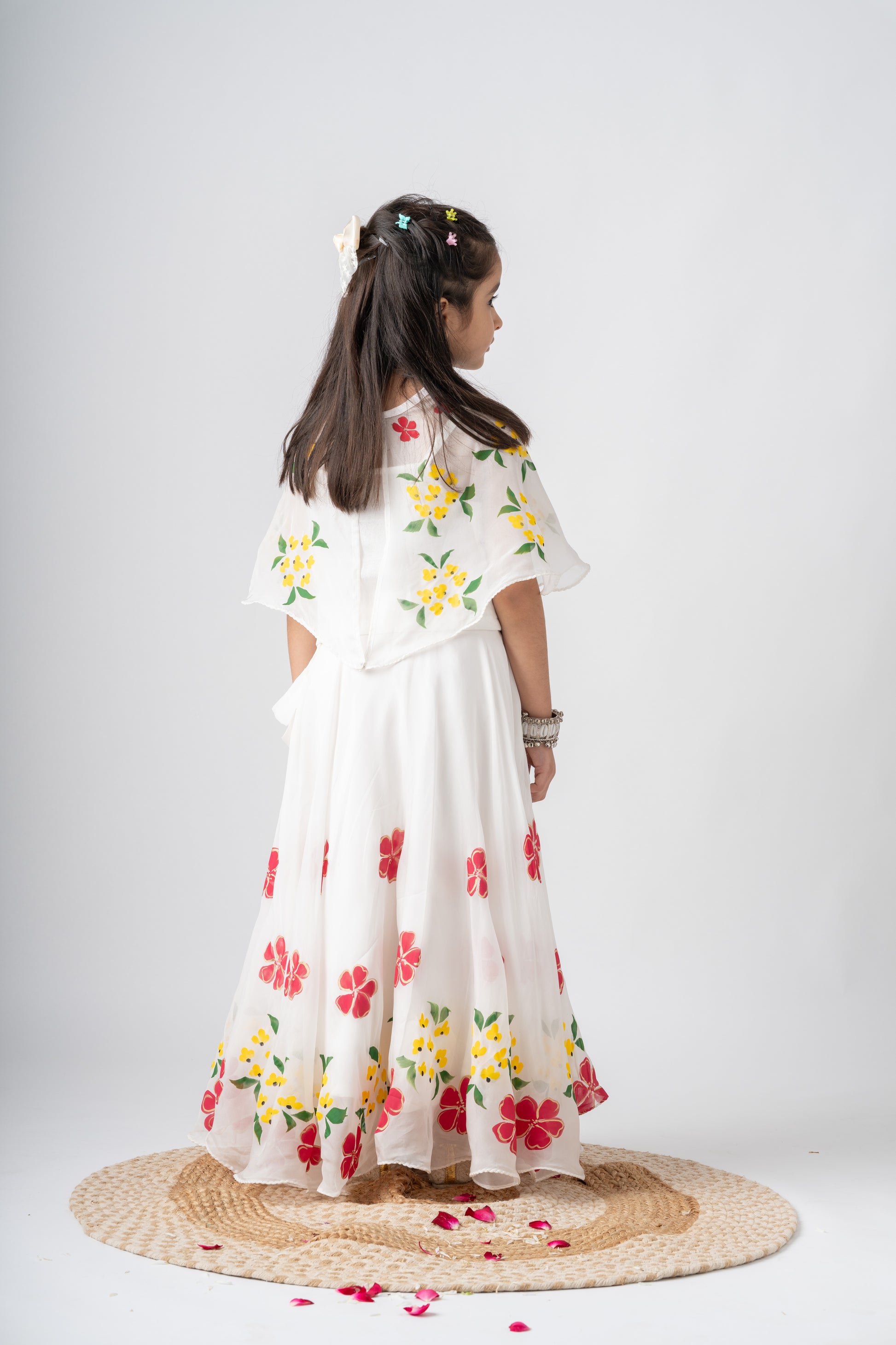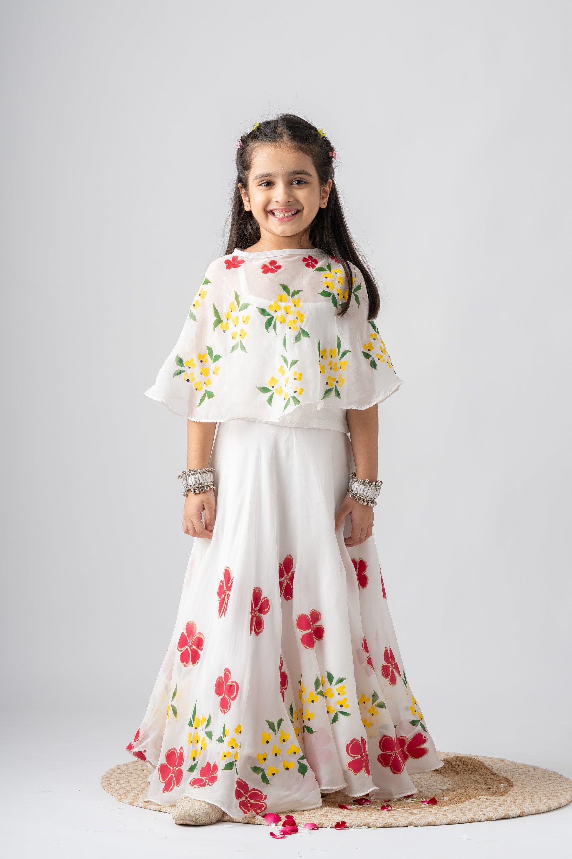 Girls Pure Organza Handpainted Lehenga Choli Set with Cape - Pastel Petals