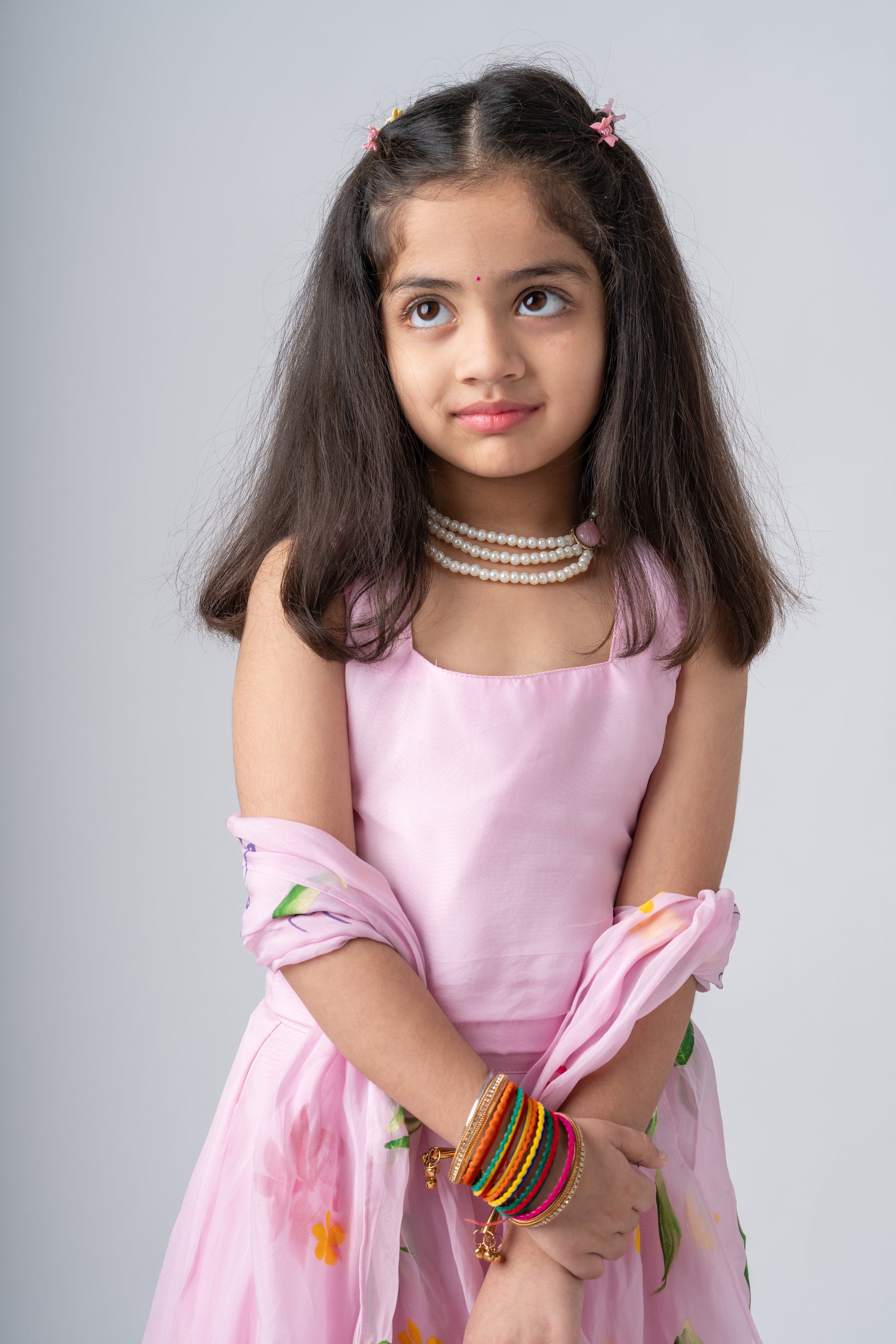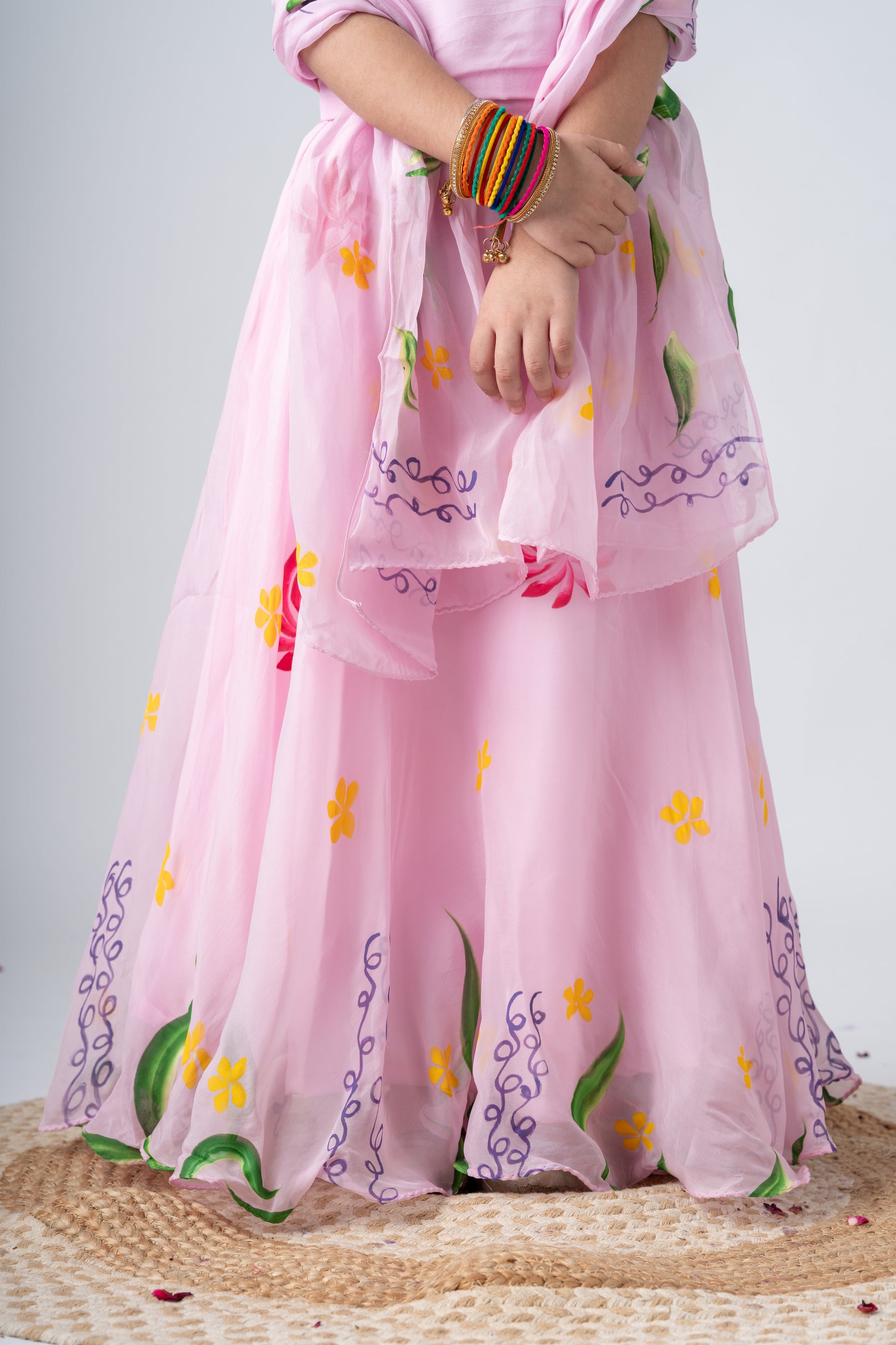 Girls Pure Organza Handpainted Lehenga Choli Set with Dupatta - Rosé Affair