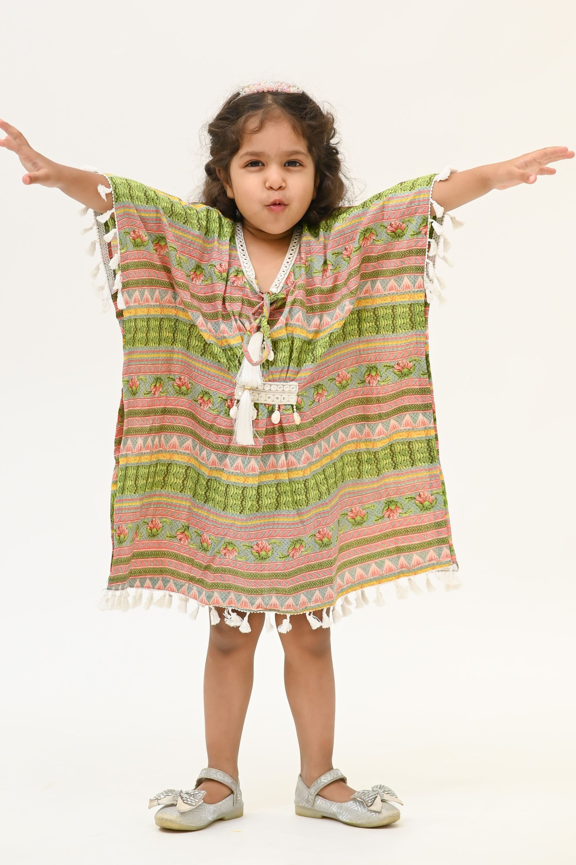Girls Rangrez Pure Cotton Kaftaan - Green/Yellow