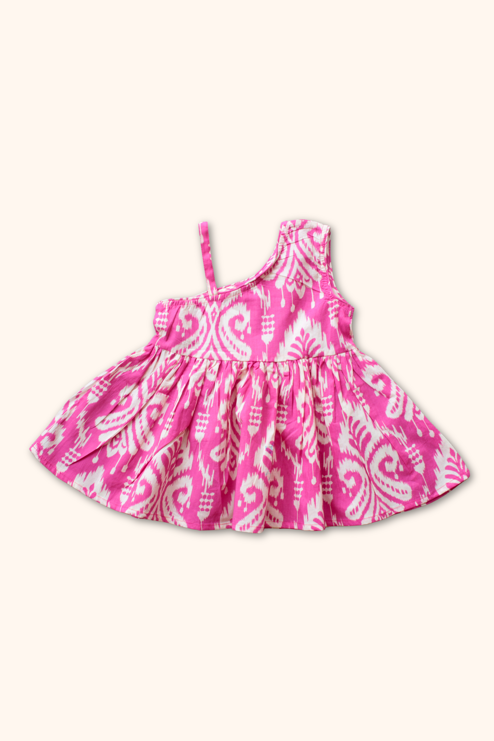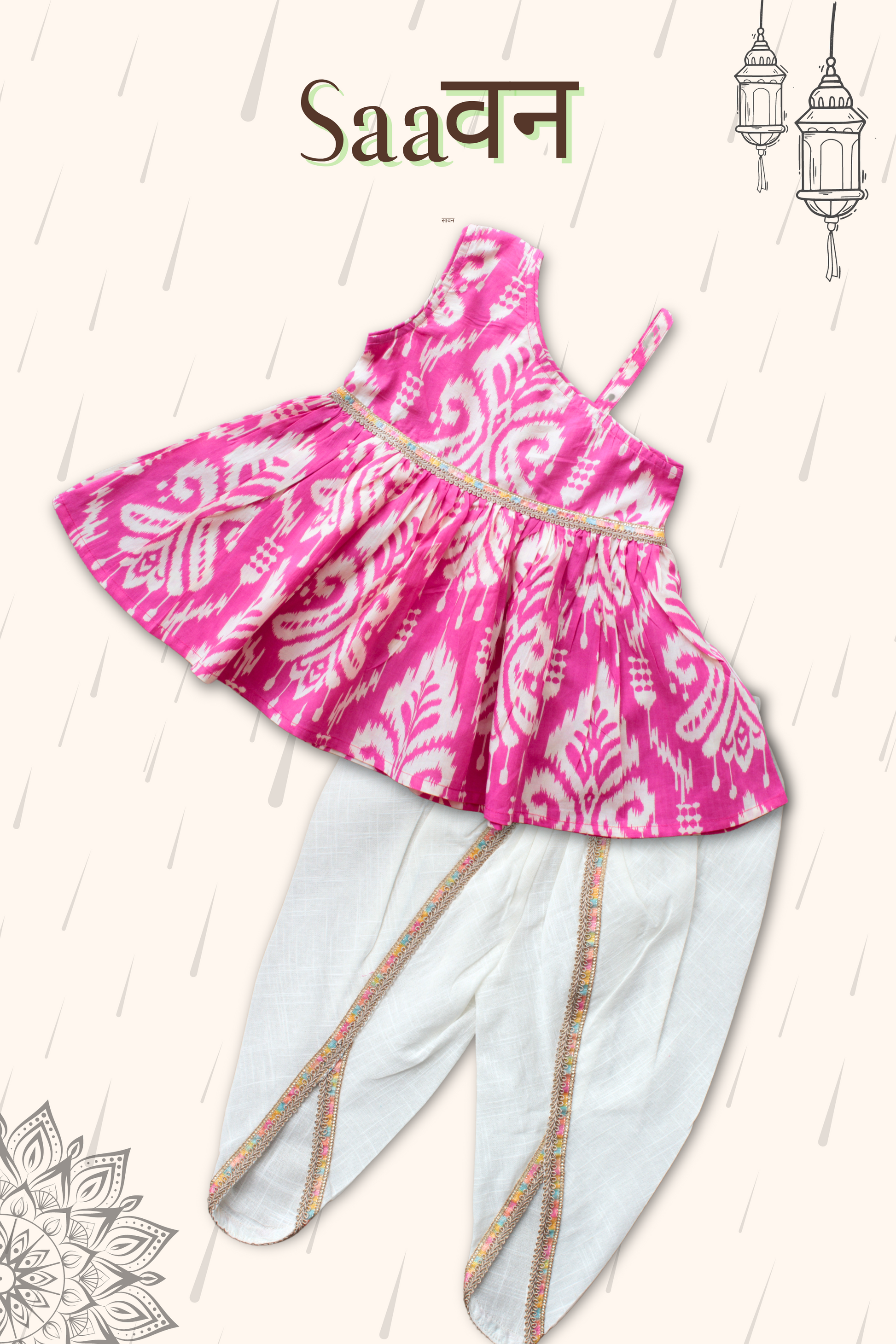 Introducing our limited edition Girls Saavan Pure Cotton Ethnic Clothing set - pink ikkat print, perfect for this festive season. Made with soft cotton fabric, in vibrant color and print, and adorned with delicate multicolor lace, this saavan collection is a must-have for any fashion-forward young lady. Elevate her style with this exclusive ethnic wear.