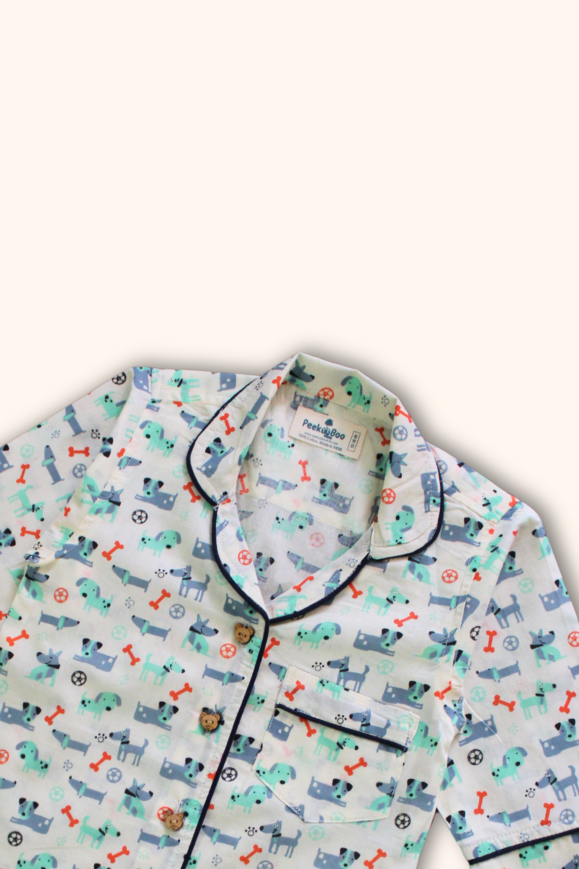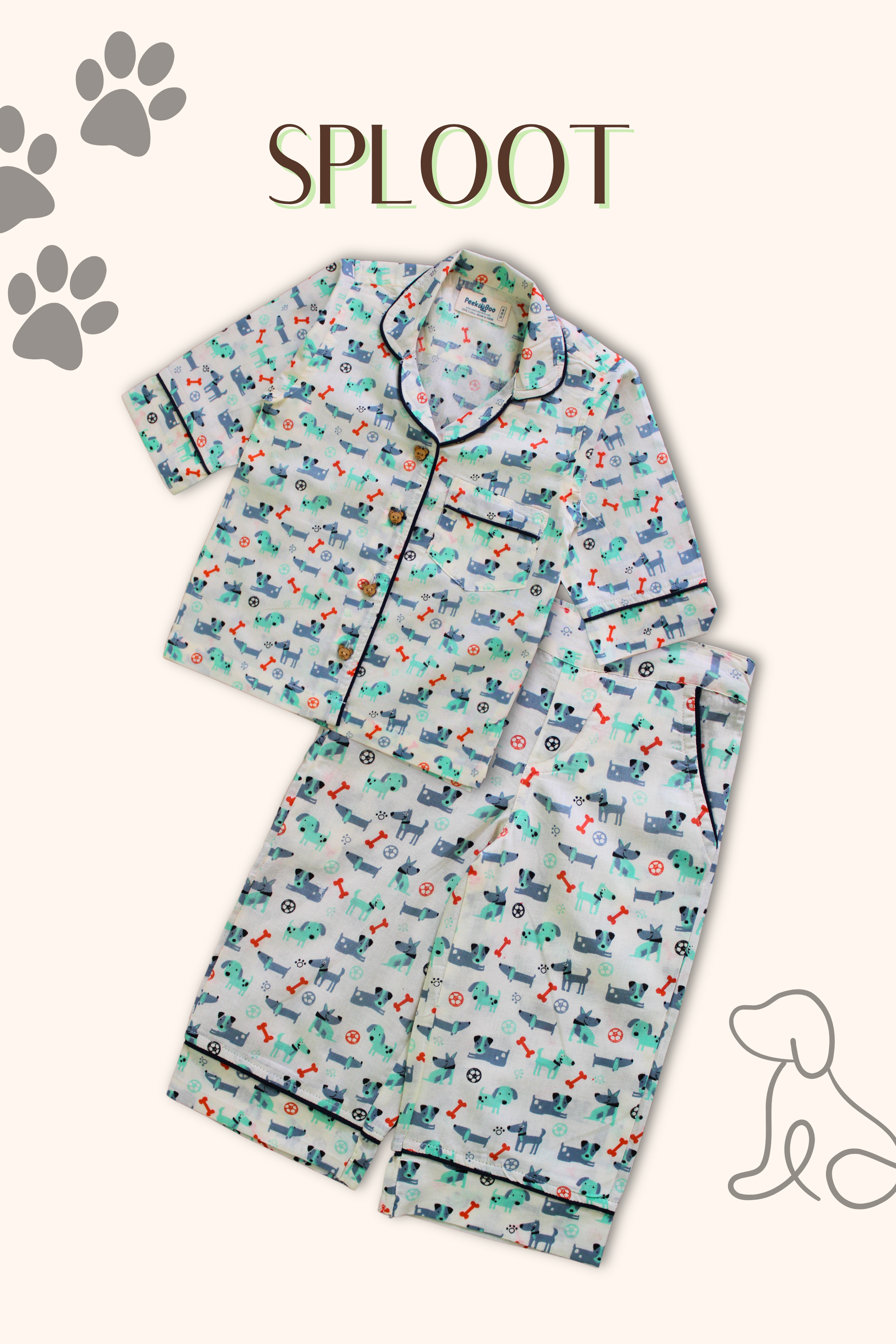 This 100% pure cotton night suit features a charming sploot print designed for cute dog lovers and offers ultimate comfort for a restful sleep in the summer. It's suitable for both boys and girls, ensuring your little one gets a good night's rest in this adorable and top-quality sleepwear.